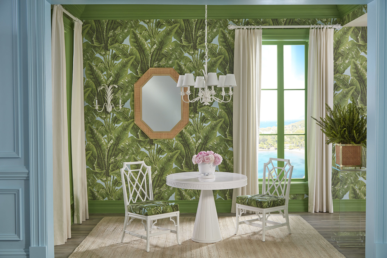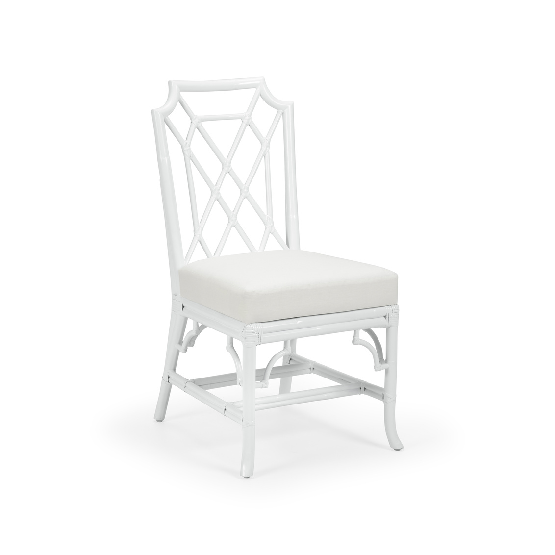 White finish on rattan fretwork side chair with attached off white fabric cushion.