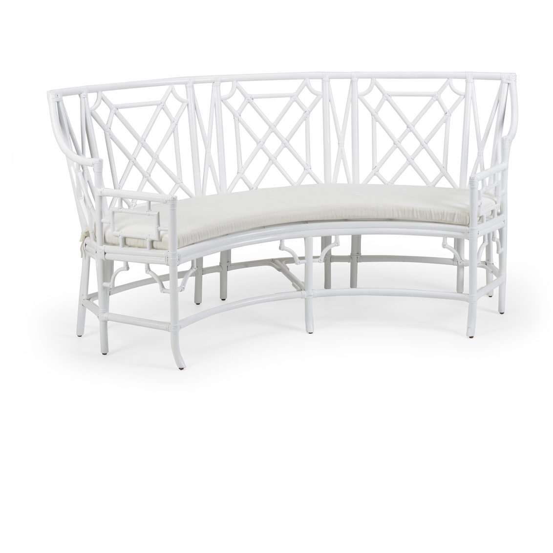 White finish on rattan fretwork curved settee with attached off white fabric cushion.