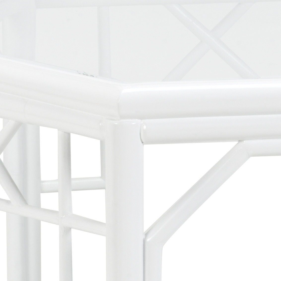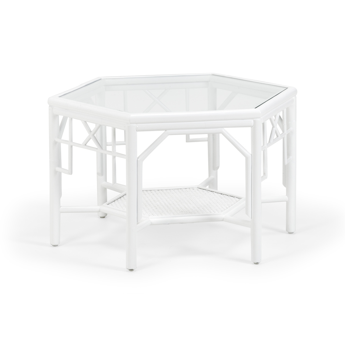 White finish on rattan fretwork hexagon cocktail table with a clear glass top and woven cane bottom shelf.
