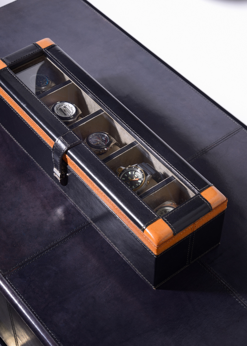 Display your watch collection in this handsome black and golden leather watch storage/display box with a hinged top. Use the... Show more