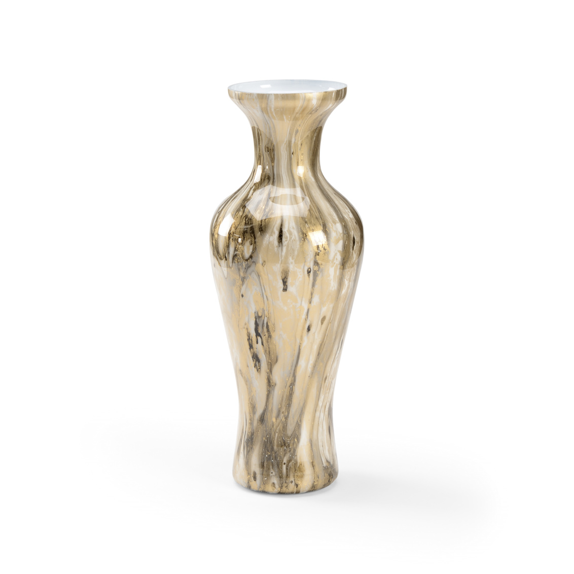 Be mesmerized by the swirls of the calacatta gold... Cream, gray and gold create a marbled pattern on this striking 18" glass vase. The graceful curves of the vase along with the swirls of the calacatta gold add visual interes and a sense of calm to any environment. Add fresh flowers for a stunning centerpiece.