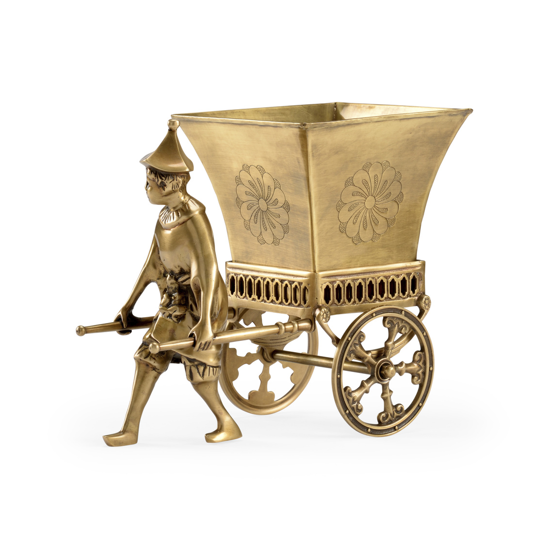 Display this exquisite Coolio Cart Planter with your favorite plant for an upscaled traditional design. Crafted of brass with an antique finish, this planter features a boy towing an ancient Chinese pull cart. The detailed wheels and a handcrafted floral design create a stunning centerpiece for a tabletop in a home or office.