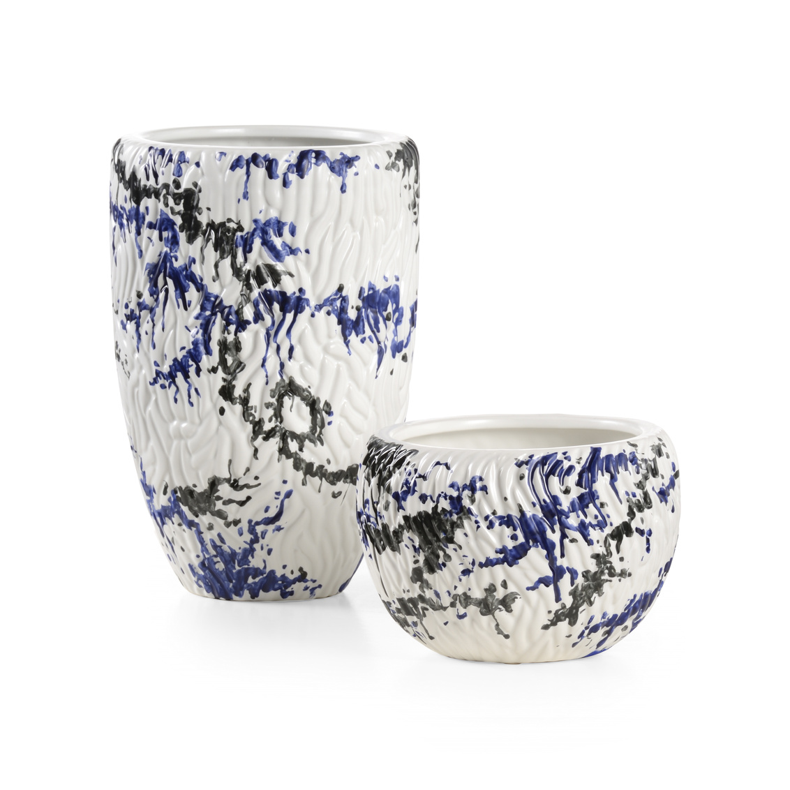 Matte white ceramic vases with black and blue paint drops, inspired by the abstract expressionist movement. Small - 8w x 8d x 5 1/2h