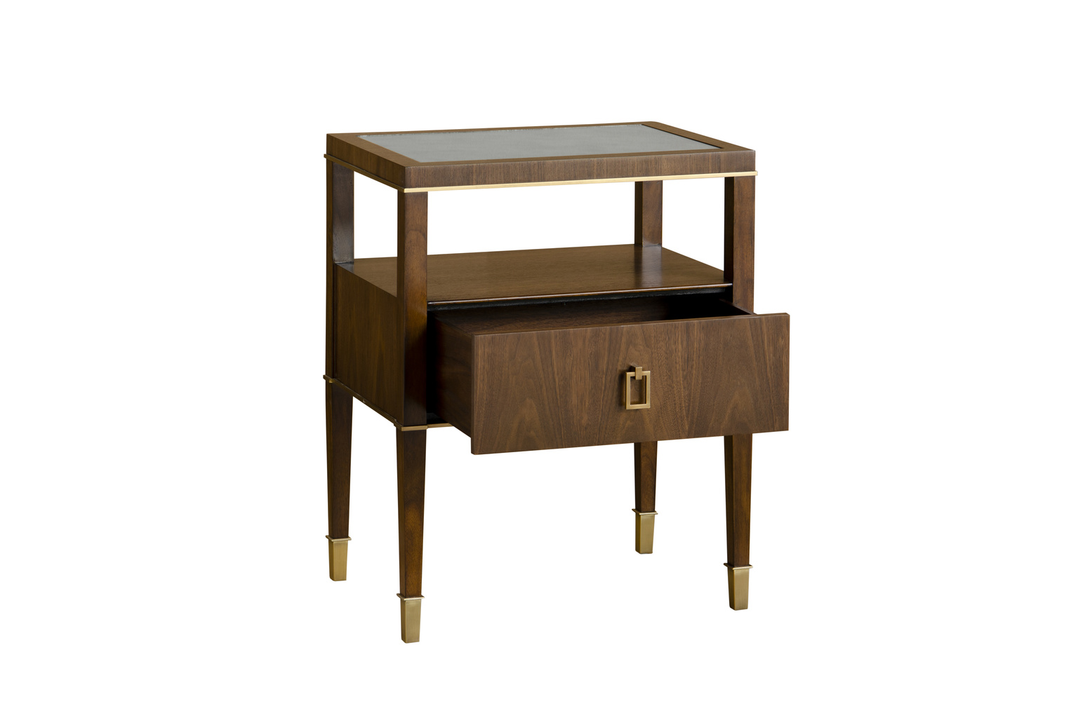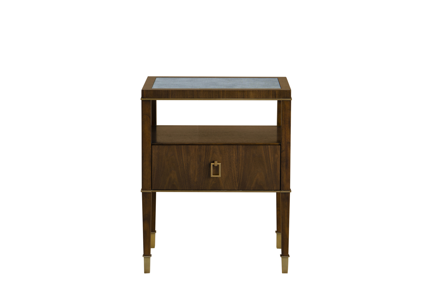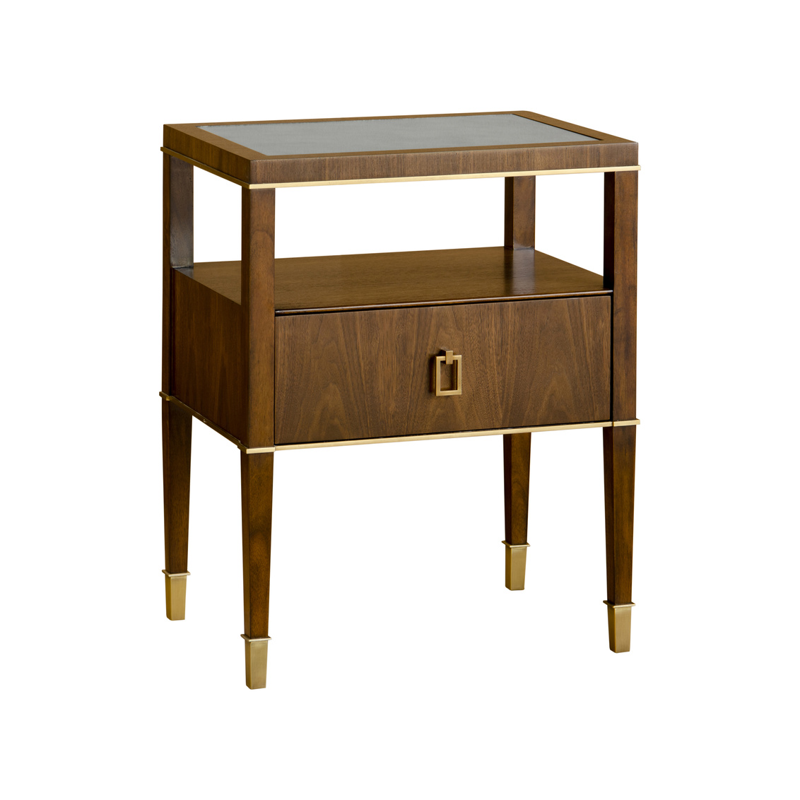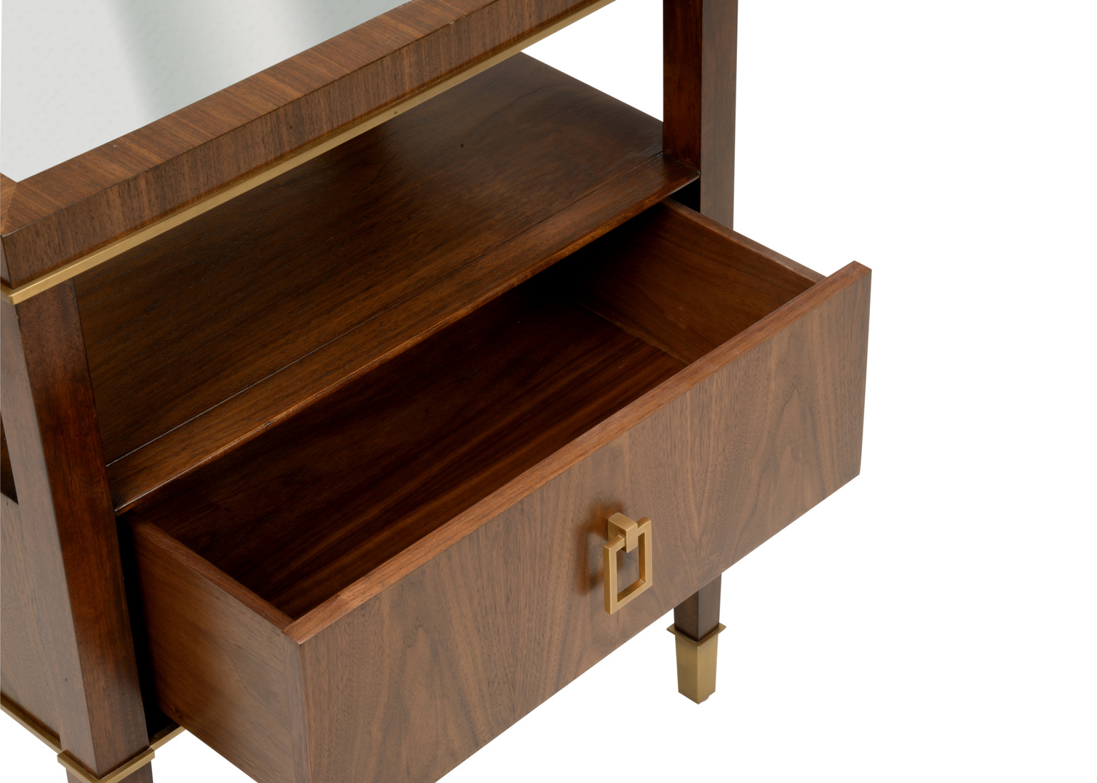 Walnut side table with shelf and one drawer with an antiqued mirrored glass. Not intended for clothing storage.