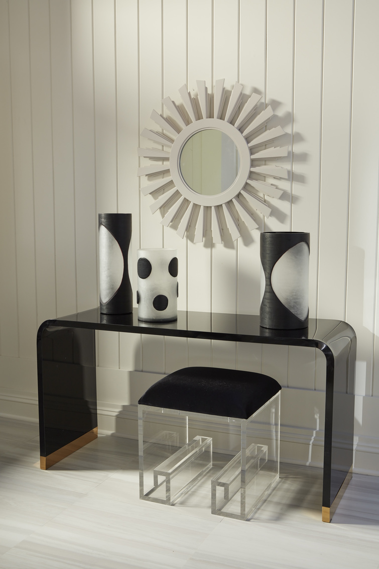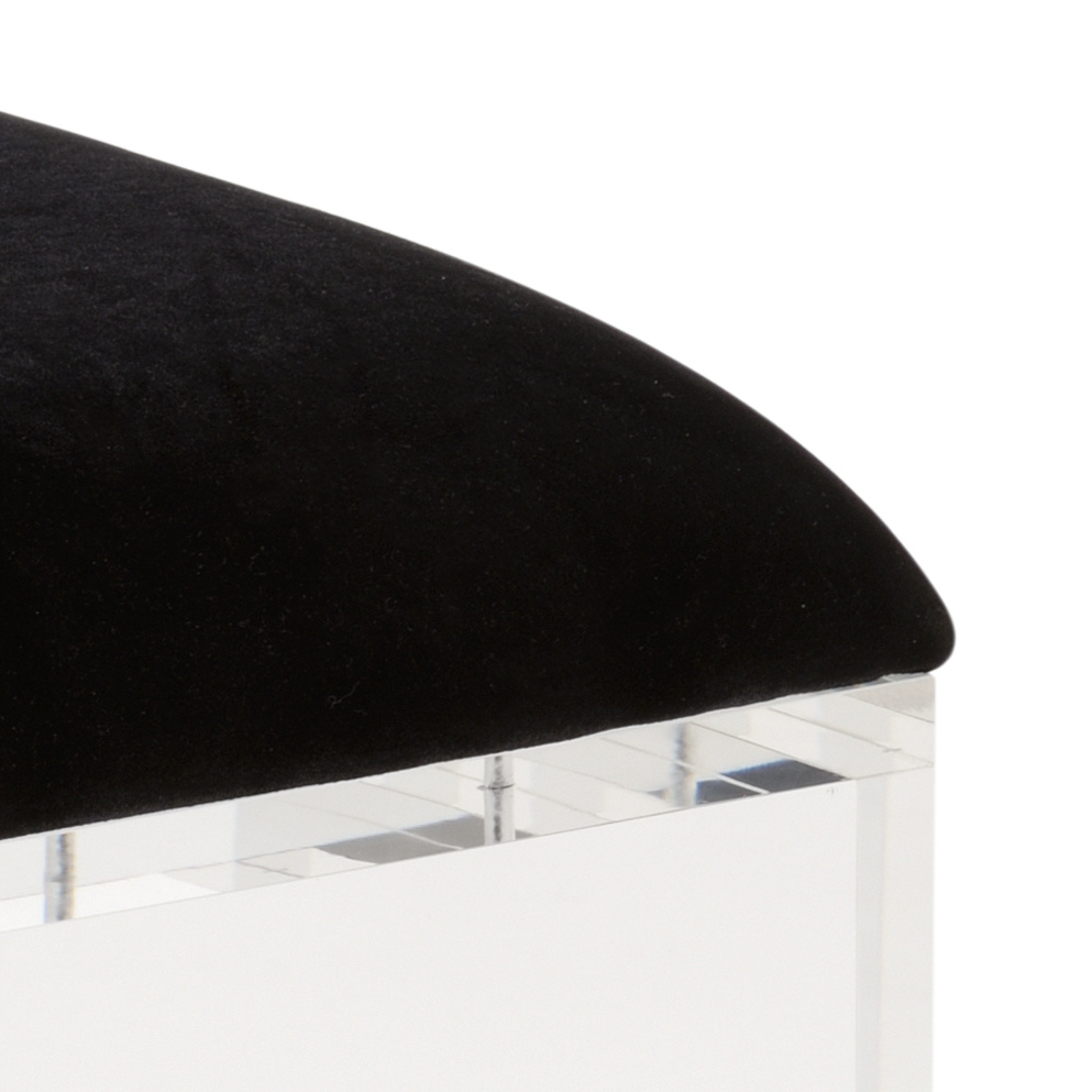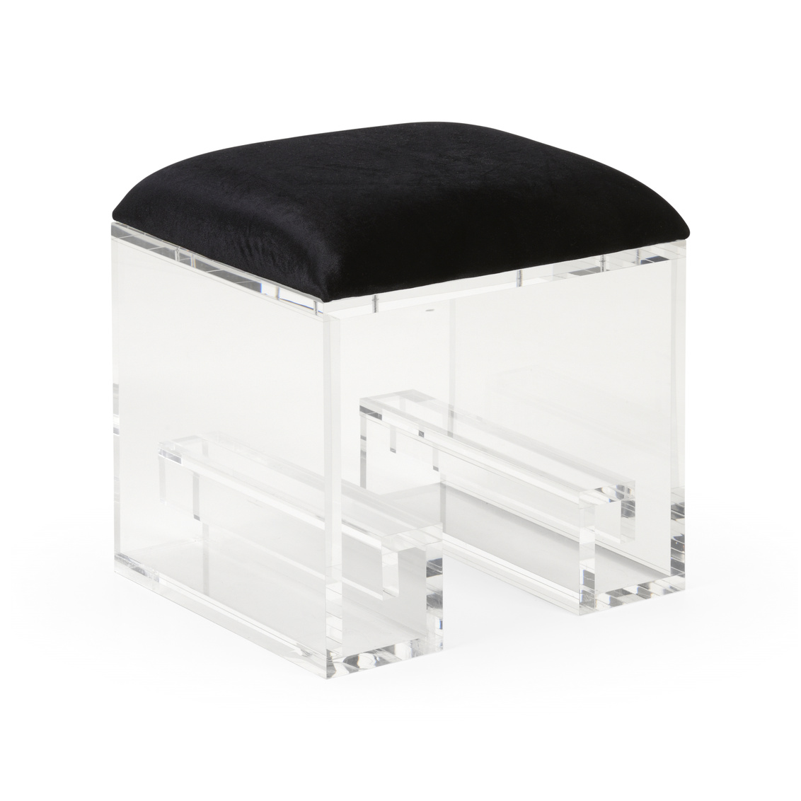 Our alluring mykonos stool features an acrylic base with curvaceous legs created by the greek key motif. Topped with a black velour cushion, it certainly doesn't compromise comfort. It is the perfect choice where space is limited, so get ready in style and enjoy the mykonos stool at your vanity, in your walk-in closet or your bedroom.