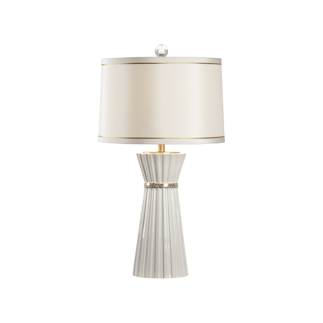 Add a touch of classic elegance to your space with our Gold Faithful Lamp. This beautifully crafted lamp showcases an hourglass silhouette that brings timeless style and sophistication to any room. The fluting detail enhances the lamp's graceful shape, creating a sense of movement and depth. At the centerpiece, a hand-painted Greek key motif provides a nod to ancient artistry, adding a layer of cultural richness and intricate design. Crowning this elegant base is an off-white silk shade that softly diffuses light, casting a warm and inviting glow. The luxurious silk shade pairs perfectly with the detailed base, enhancing the lamp's overall aesthetic while ensuring it integrates seamlessly into a variety of decor styles.