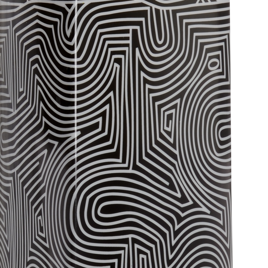 Bring sophistication to your space with this black and white glazed ceramic canister with metallic gold trim. It features a unique triangular shape that boasts a captivating geometric design. An off white silk shade and round brass finial lend elegance to this transitional lamp that is sure to be a focal point in a bedroom or living area.