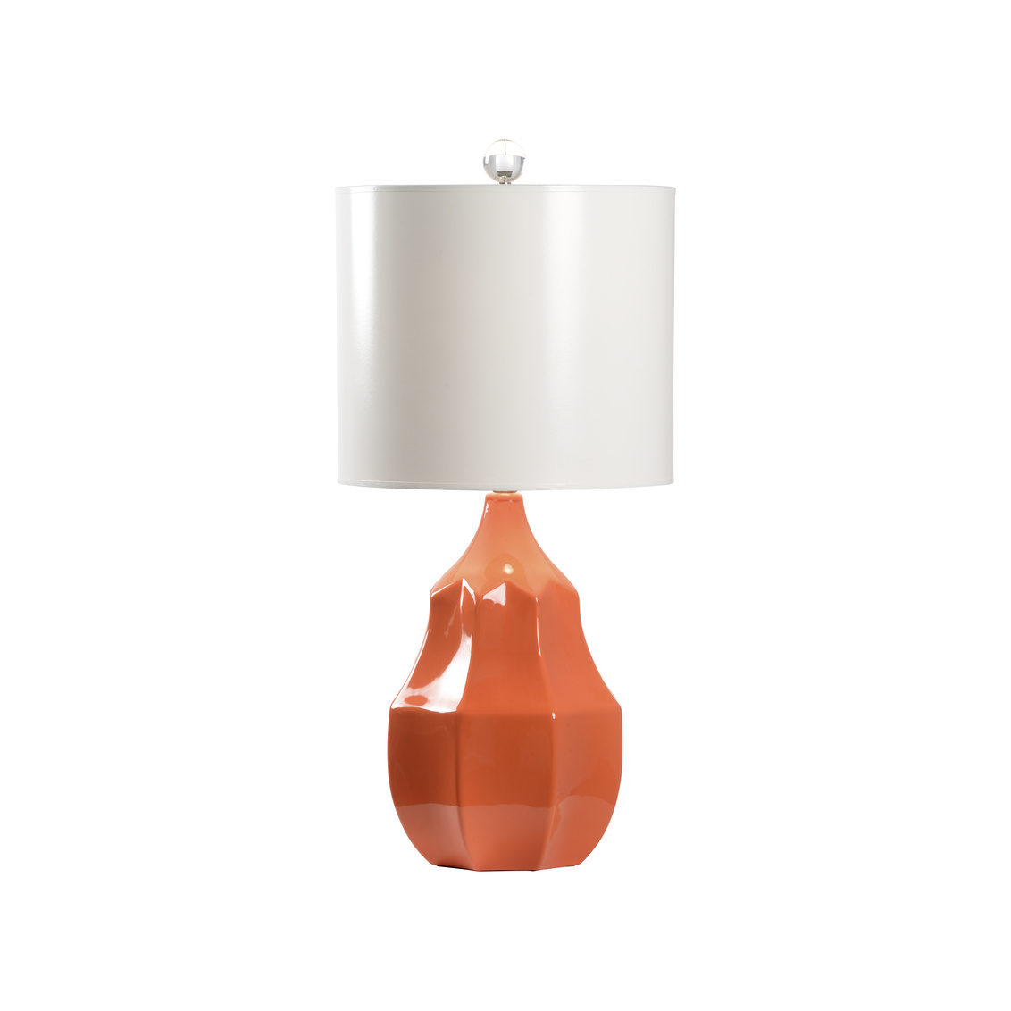 Enliven your home decor with our Soft Glow Lamp. This vibrant orange glazed ceramic features a textured body that reflects light throughout your space. A super white flossy drum shade tops this whimsical table lamp ideal for a bedroom or game room.