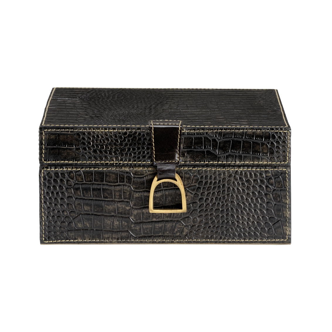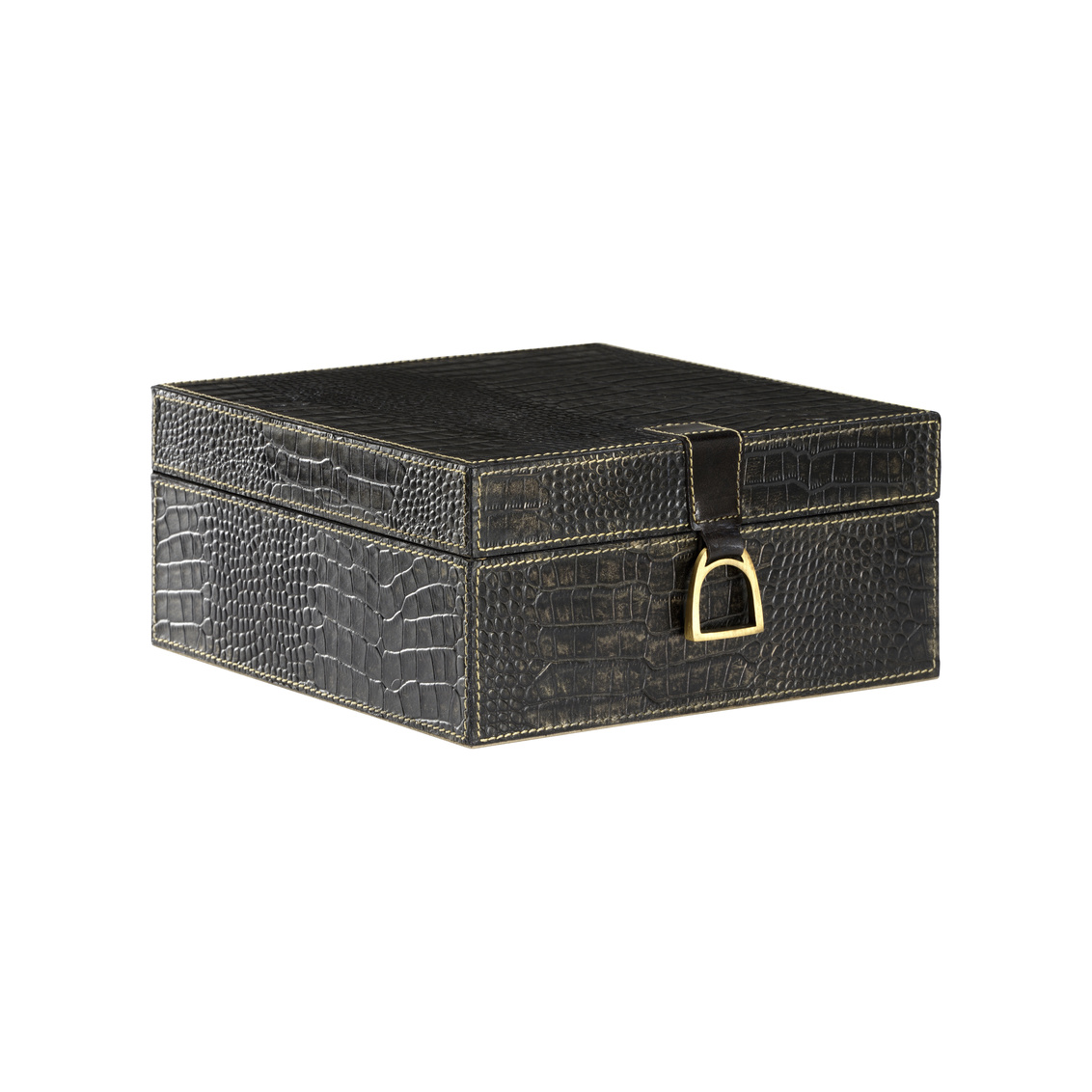 Decorative boxes are a great way to store stationary, watches, office supplies and more. Featuring embossed black crocodile leather with detailed stitching, Croc Box blends effortlessly in a modern home or office. The stirrup handle detail along with the hinged lid allow for easy access into the felt lined interior. Use as a stand-alone on a tabletop or combine with various size Croc Boxes (302214,302215) for cohesion on shelves throughout your space.