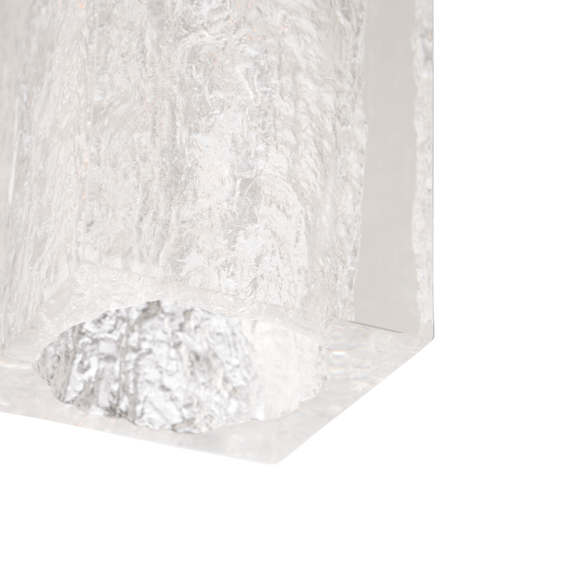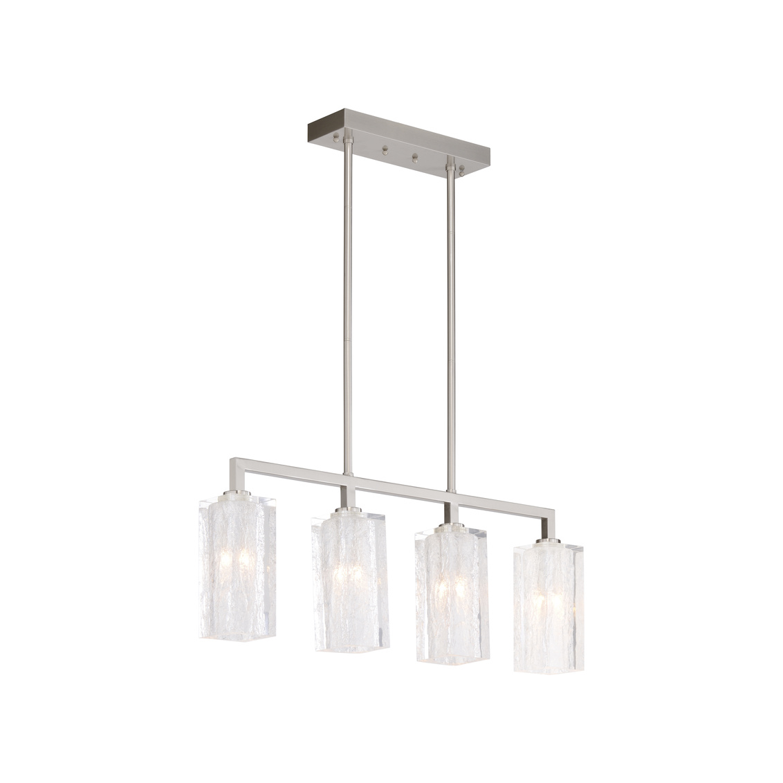 Lucallan four light pendant is a modern linear design perfect for over a kitchen island or bar. A satin nickel frame supports four lights that provide a softened warmth beneath shades of ice textured blocks of acrylic.