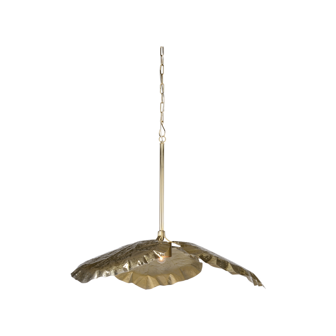 Create a tropical oasis in your coastal home design with our Tropical Leaf Pendant. Crafted in steel with a warm antique brass finish, a single exposed bulb illuminates radiant light from the center of the three large tropical leaves. Comes with rod and three feet of chain for hanging.