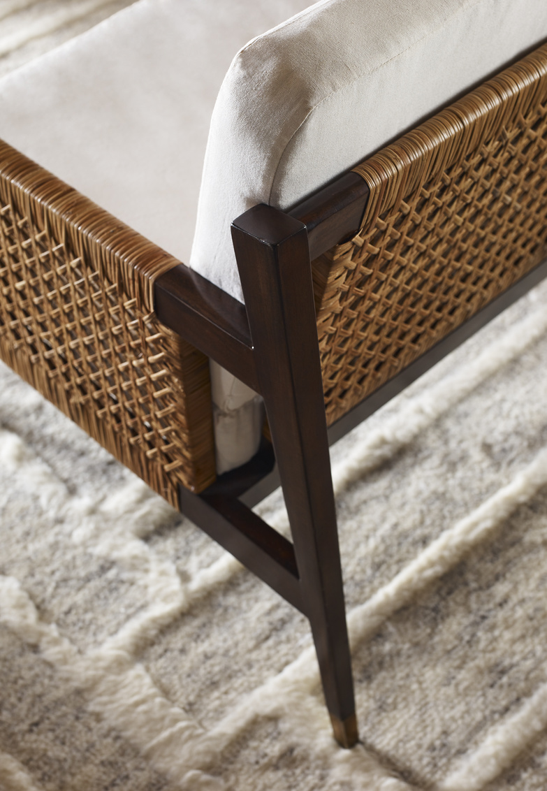Relax in your home or office with isle of Palms Lounge Chair. Hand crafted of solid gmelina arborea, the frame features natural woven cane which provides a textural twist. Removable foam cushions are added for comfort. Tapered legs are finished with brass ferrules for an upscale coastal design.