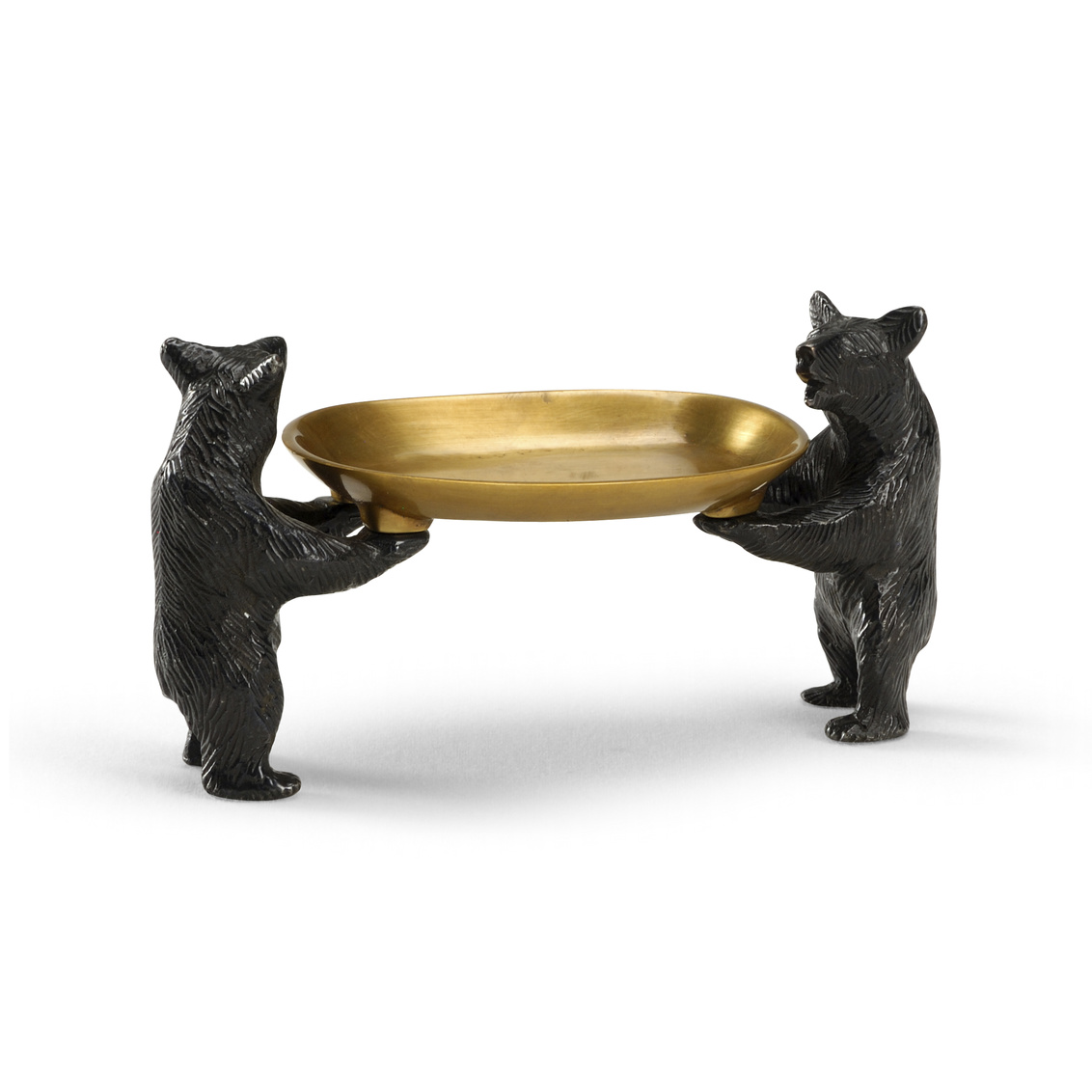 Display form and function with this charming bear accent. Bears Bearing Dish features a solid brass cast design ideal for any rustic modern home or office. The bears have an antique bronze finish and are holding a tray with an antiqued patina. Use on the mantel of your mountain cabin to hold matches or on a table in the entryway to hold keys.
