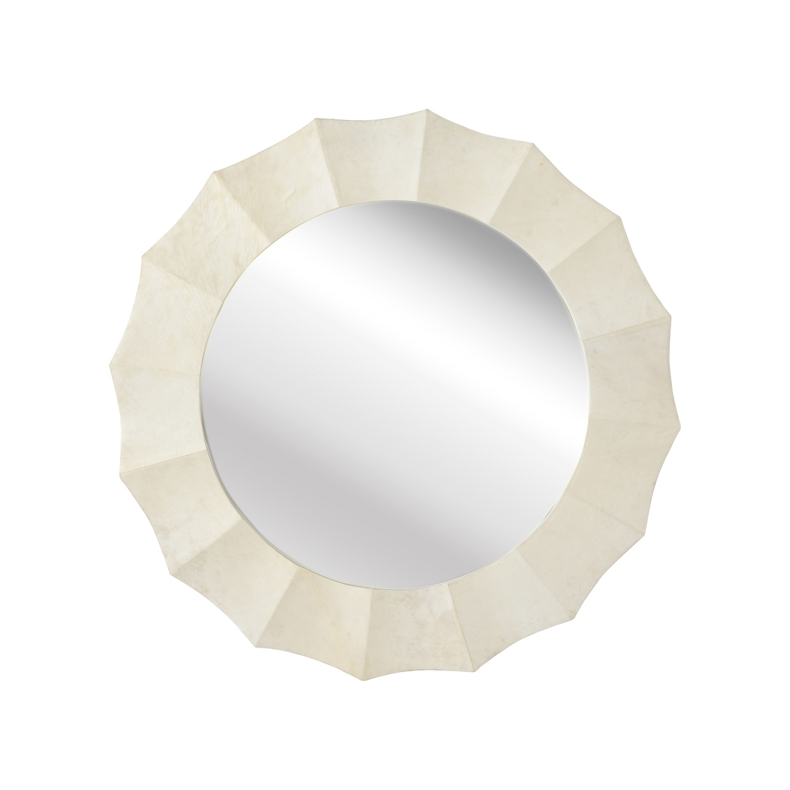 Bring texture and dimension to your modern space with our Bride's Dream mirror. Over a console in the entryway or on an accent wall, this round mirror features a cream parchment covered wood frame that will add an artful sophistication to your decor.