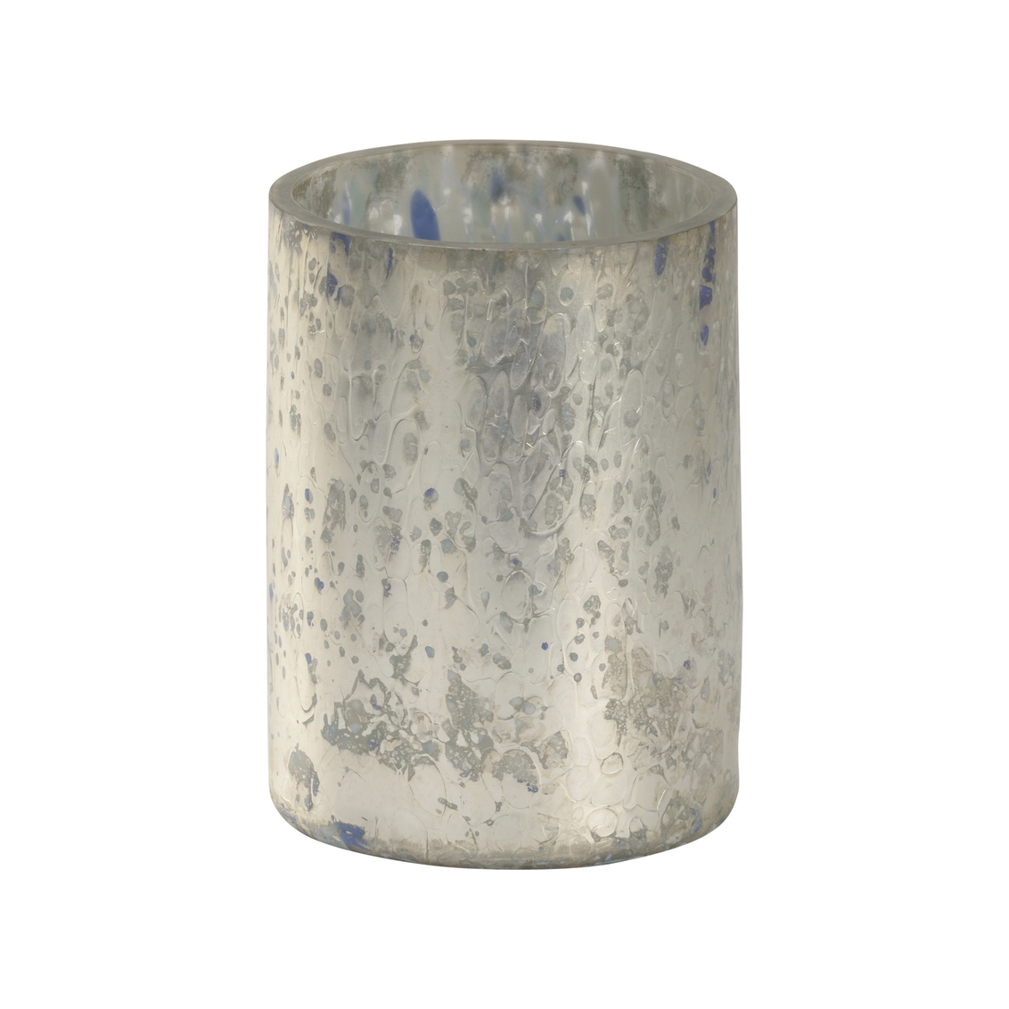 Designed for tabletops and bookshelves in a modern home, sic silver vase features a matte silver finish with shades of blue, cream, and teal shining through. Add a votive or small floral bouquet to enlived your bedroom, entryway or living area. Create a greater visual impact by pairing with various sizes (302381,302382).