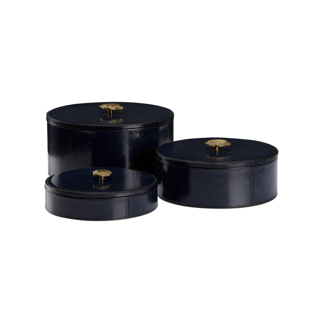 Decorative boxes are a great way to store office supplies, jewelry and more. Featuring a luxurious blue leather with detailed stitching, this set of three round boxes will blend effortlessly into any decor. The interior is lined with felt to protect your valuables. A stylish antique brass knob enables you to lift the removable lid with ease.