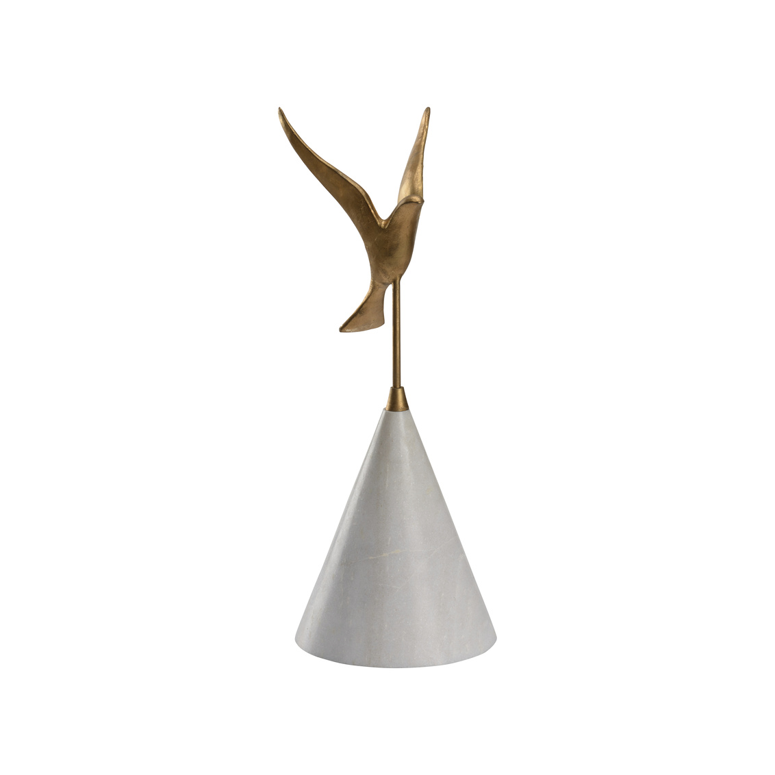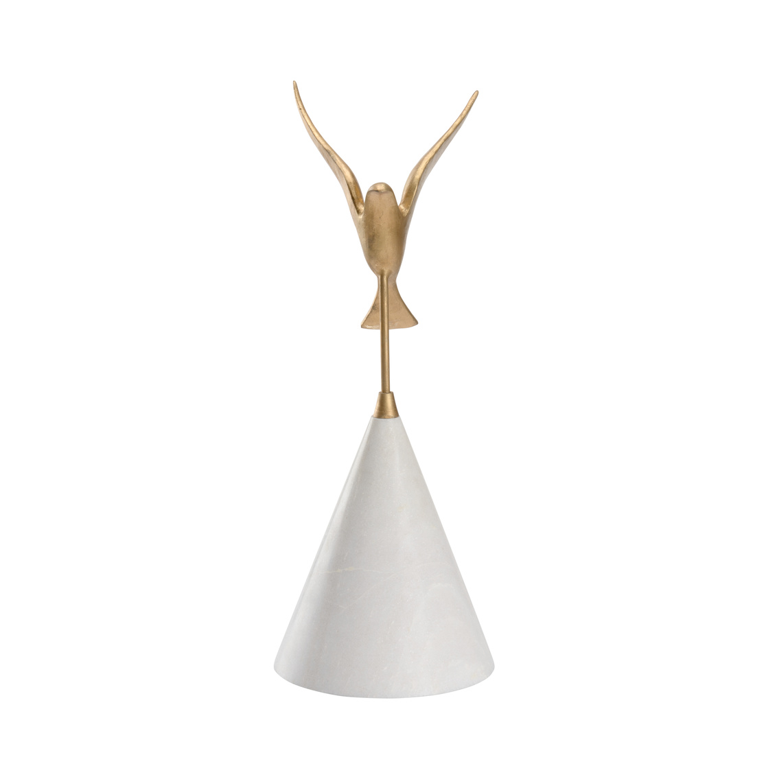 This elegant bird sculpture is the optimum choice for the nature lover. Flights of fancy features a cast iron bird with a metallic gold finish that is in flight over a natural white marble base. Ideal for displaying on tabletops or etageres in your contemporary home. Also comes in various sizes that can be paired to create a focal point in your design. (302409,302410)