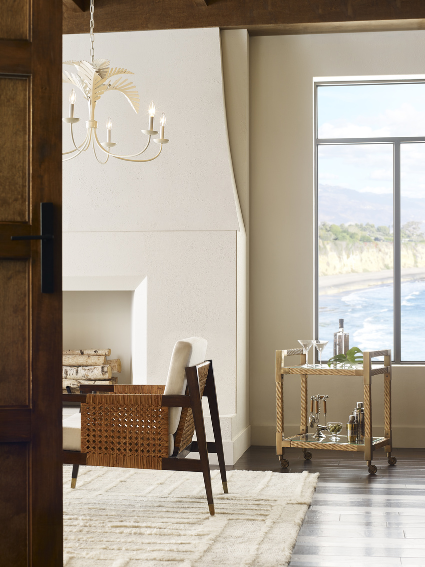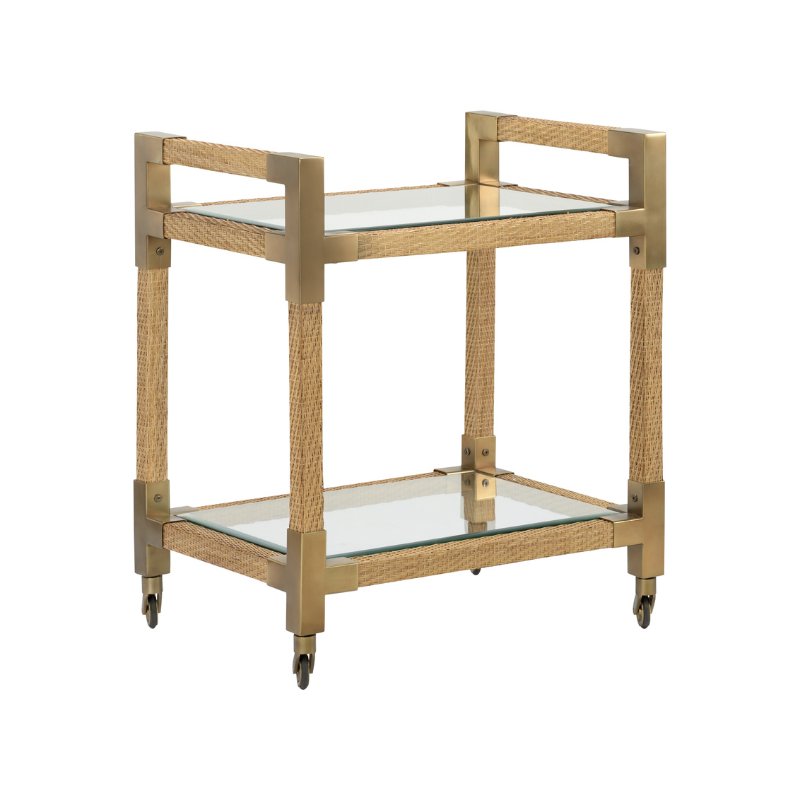 Move the party from room to room with our Vieux Carre Bar Cart. Featuring natural, woven cane with bronze corner brackets, its two glass shelves hold bottles, glassware, your favorite decorative accents and more. Casters allow you to transport snacks with ease. Reflect your modern, coastal style by displaying this versatile piece in a kitchen, home bar or entertaining area.