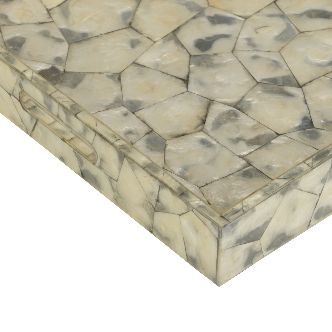 Covered in gray tortoise capiz shell, shell shock tray is ideal for serving guests at a cocktail party or holding... Show more