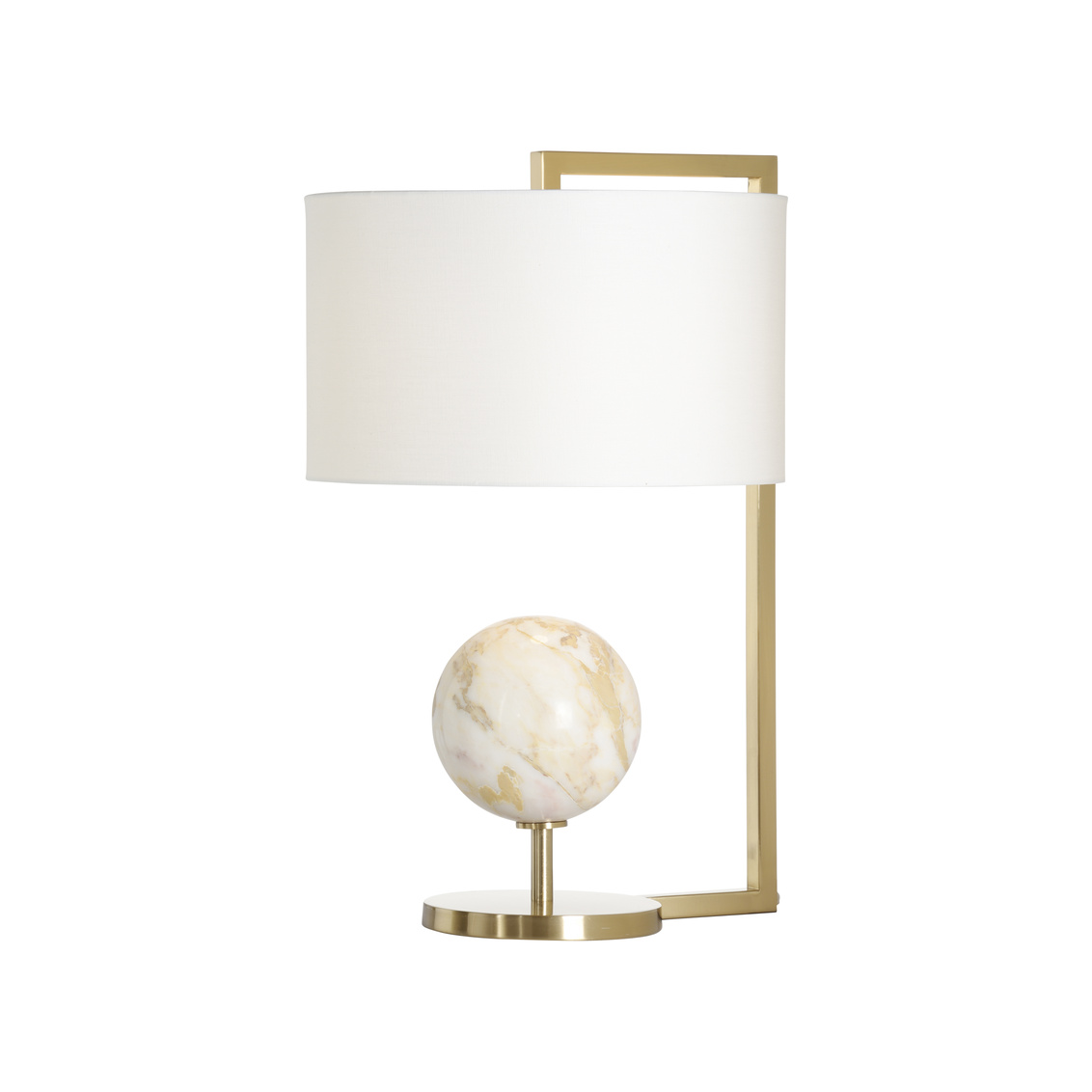 Calabria lamp features a ball of natural calacatta gold marble supported on a metal base with a warm coffee bronze... Show more