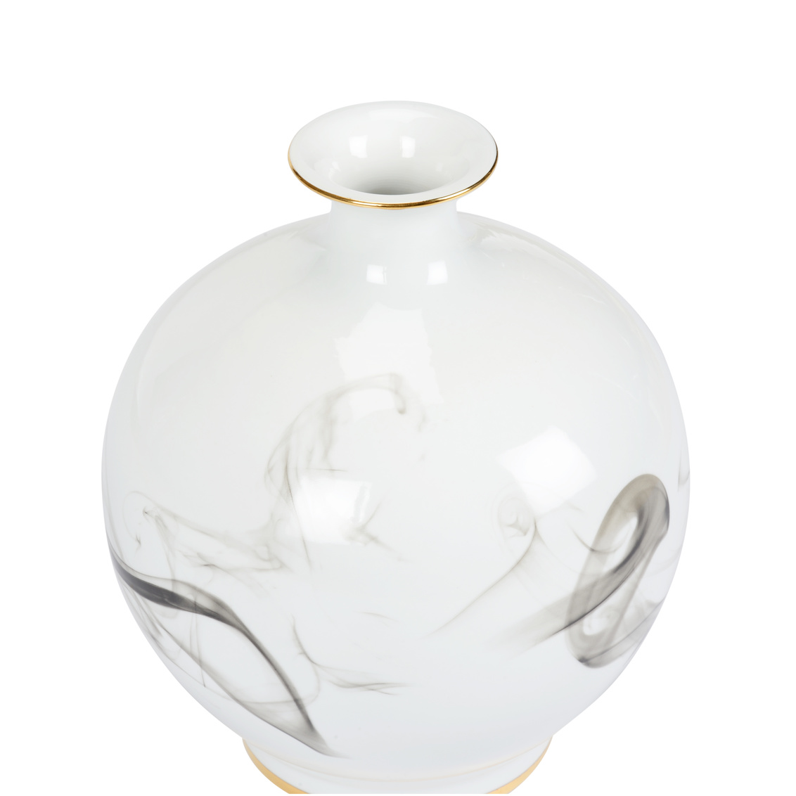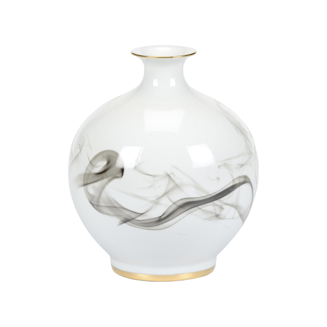 White cinder and smoke vase is crafted of white glazed porcelain with a hand painted black smoke design. Metallic gold trim adds an elegance to the accent piece ideal for tabletops in any home or office.