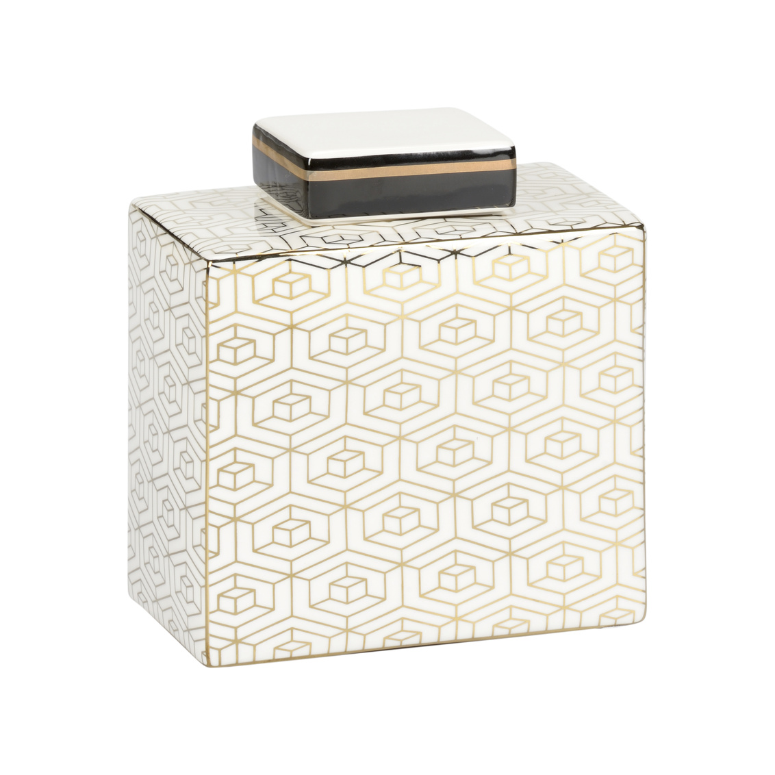 Clara canister provides function and beauty. The white glazed porcelain is the background for the eye catching metallic gold geometric pattern. The rectangular design adapts easily to many spaces and has a removable lid for storage of small items.