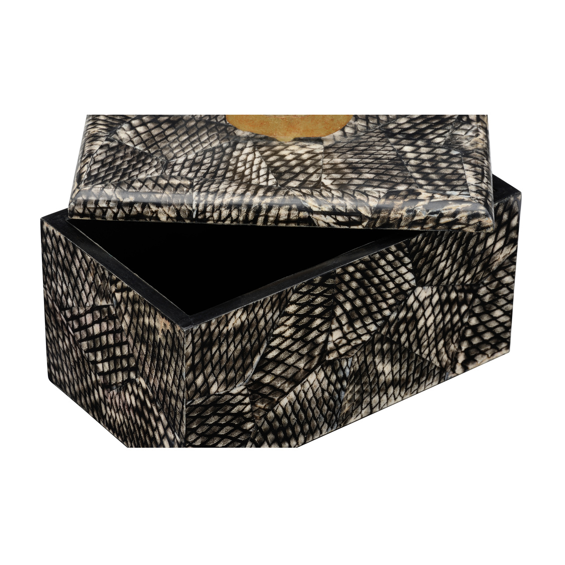 The Nazare box features a unique black fish scale finish to store small objects in style. The brass handle on the lidded top plays with negative space and organic form.