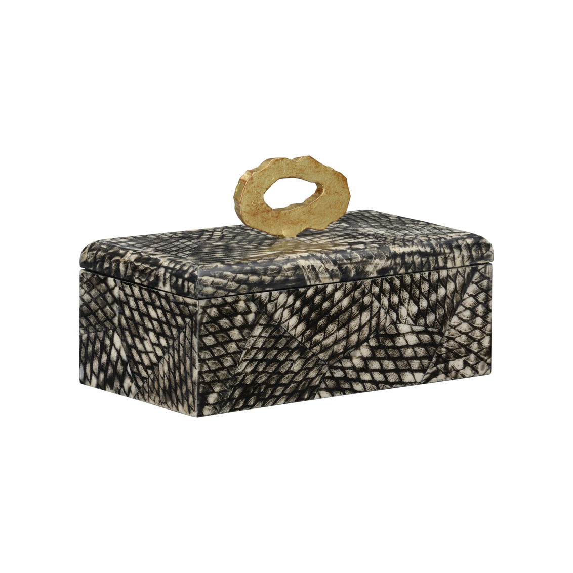 The Nazare box features a unique black fish scale finish to store small objects in style. The brass handle on the lidded top plays with negative space and organic form.