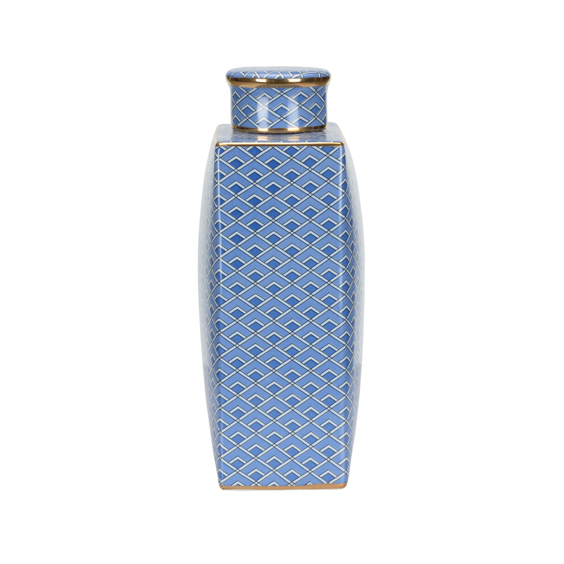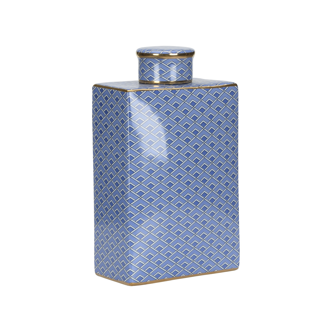 Adorned with a vibrant geometric pattern in classic colors and gold accents, the Kelly jar is a striking piece of decor that complements a variety of styles.