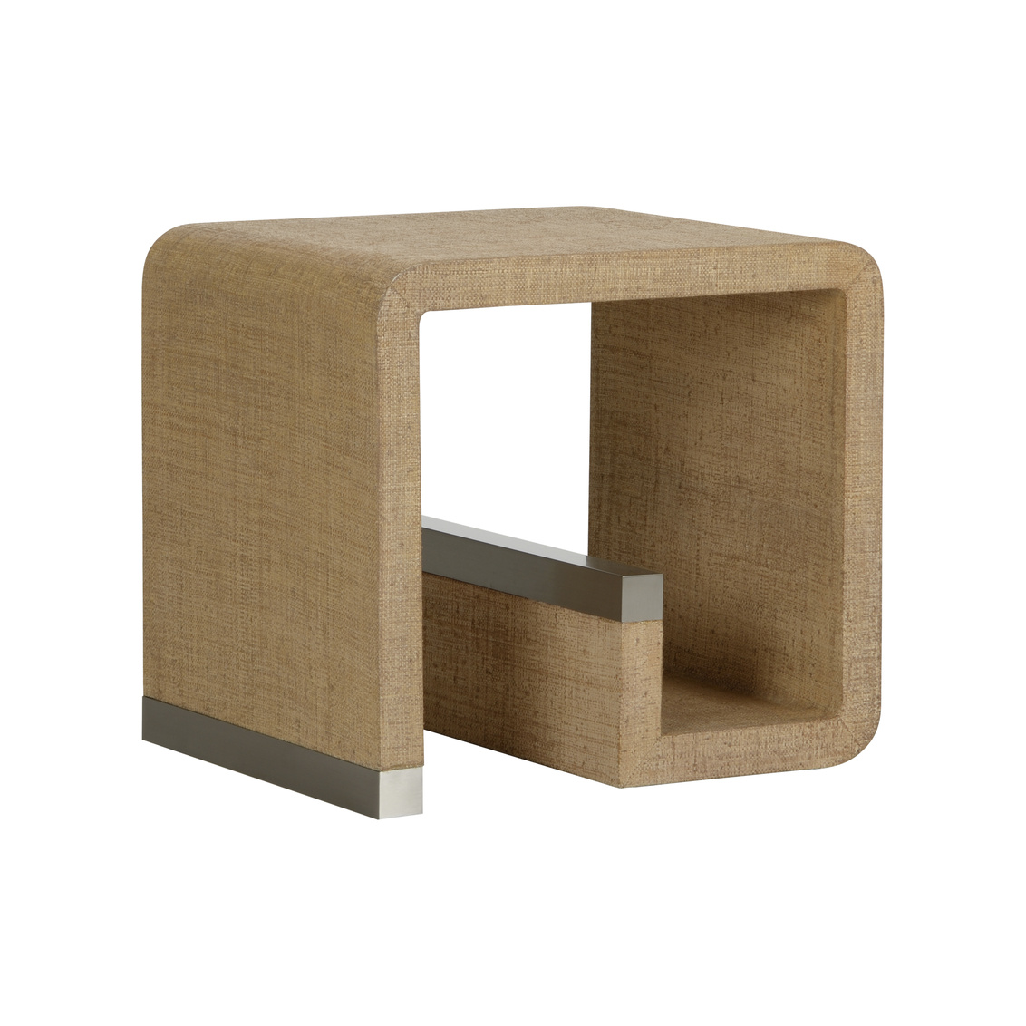 The open Greek key shape of the Hera end table is a versatile piece that can complement a variety of styles. This wooden table is wrapped in natural Saguran for a sophisticated yet durable finish. The brushed metal accents add further material interest and elegance.