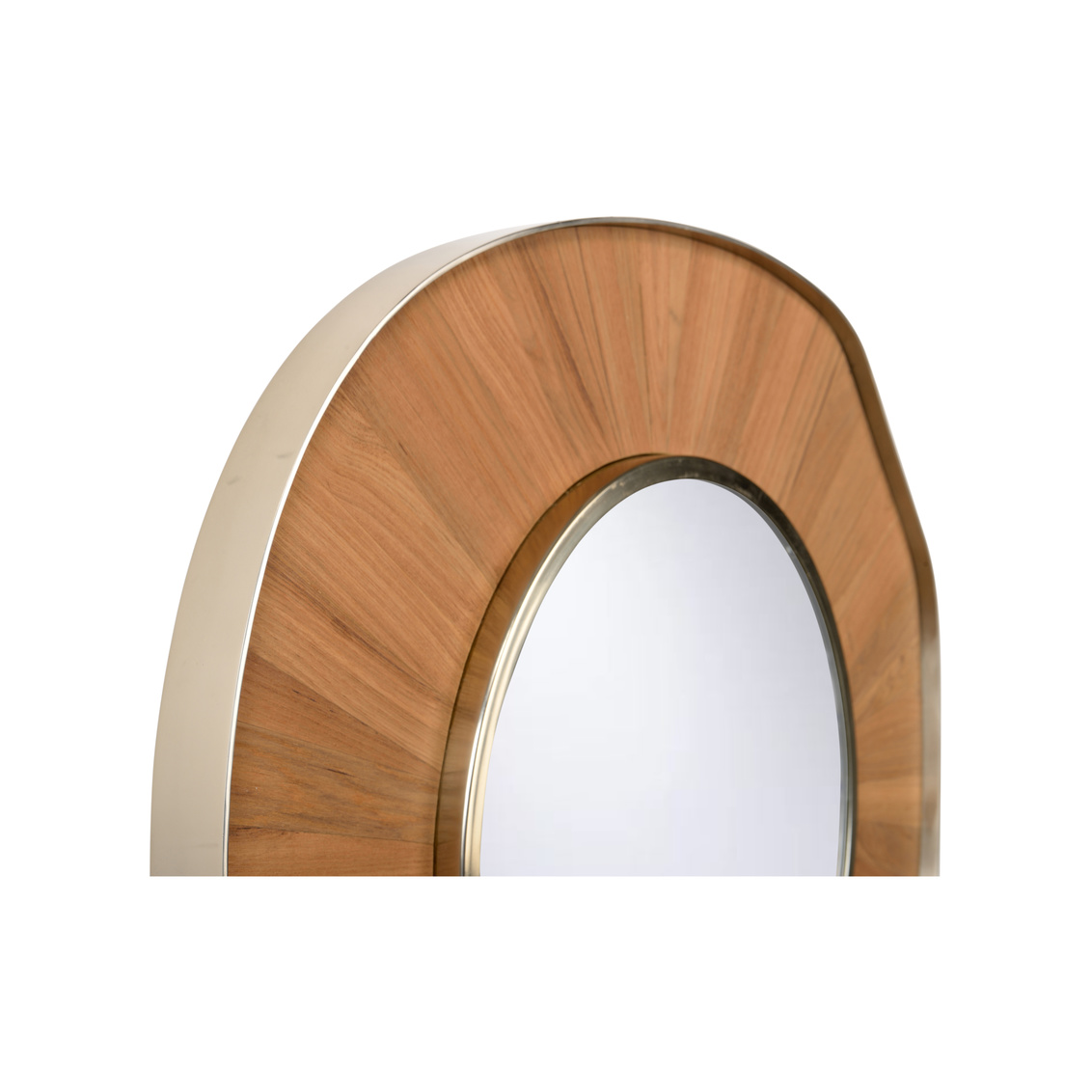 Our Pith Mirror is intriguing to the eye with the combination of its natural materials and organic shape. The soft curves of the rich teak wood and brushed nickel finish are ideal for foyers and other living areas.