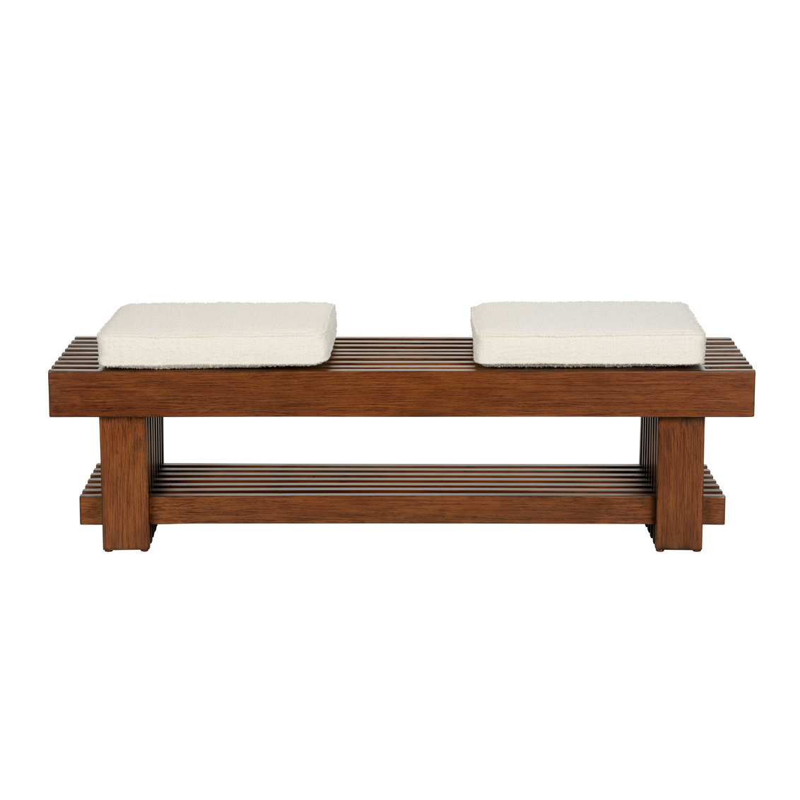Introducing our Maki Bench. A stunning bench that combines classic craftsmanship with modern comfort, featuring a sleek slatted wood frame and two plush cushions upholstered in performance boucle fabric (poly blend). The elegant design showcases the natural beauty of the walnut, with clean lines and a sophisticated silhouette that enhances any decor. Ideal for use in entryways, living rooms, or at the foot of a bed, this bench is a versatile and stylish addition to your home.