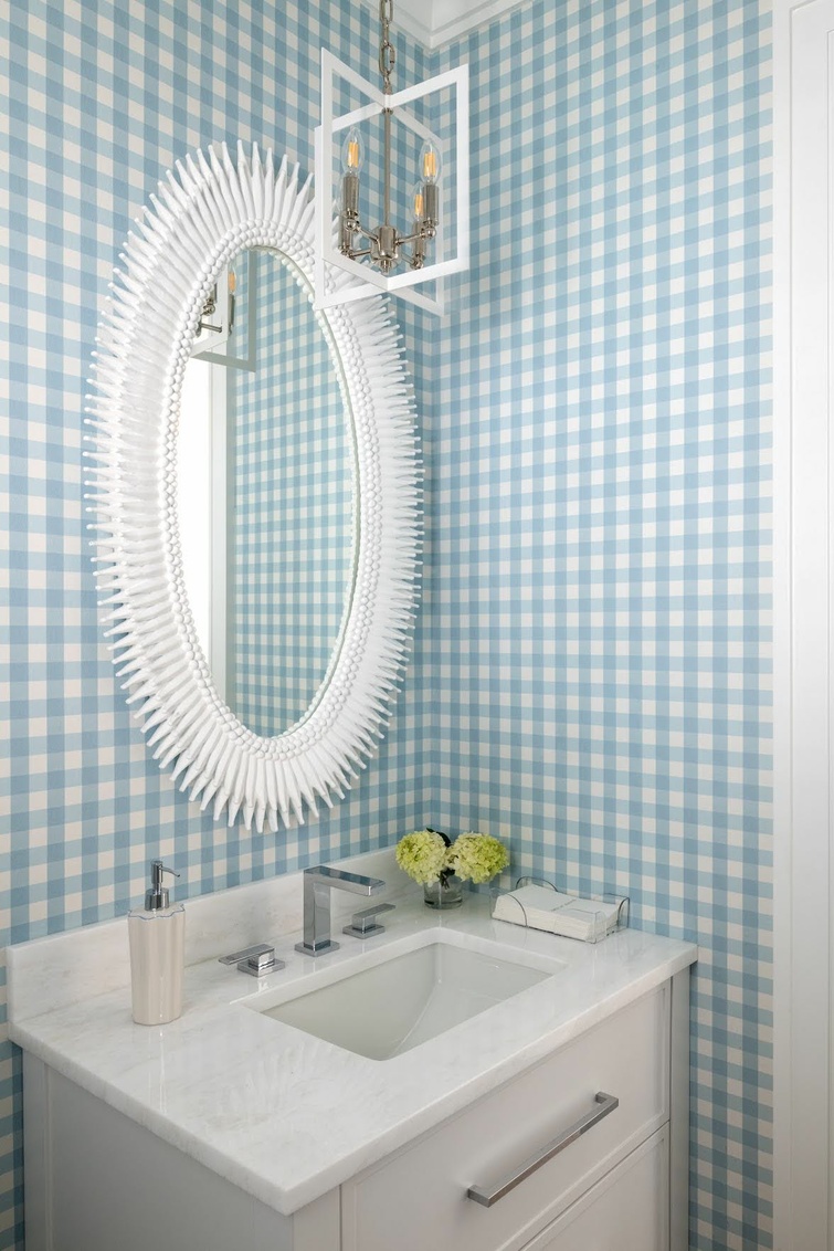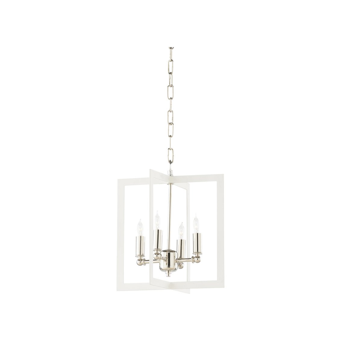 The Bayberry Hanging Small Chandelier by Megan Gorelick Interiors is ideal for over bathroom vanities. The crisp white finish and polished nickel accents provide a super clean aesthetic.