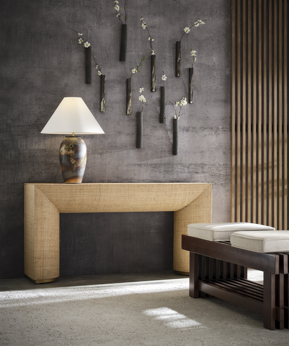 The Chaiaki Table Lamp, part of the Shiga collection, is hand turned with special local sandy clay from the bed of Lake Biwa creating this unique, durable artful lamp completed with cloth wiring and a refined rolled-edge linen shade. Made in Japan.