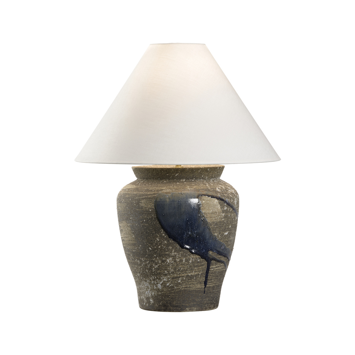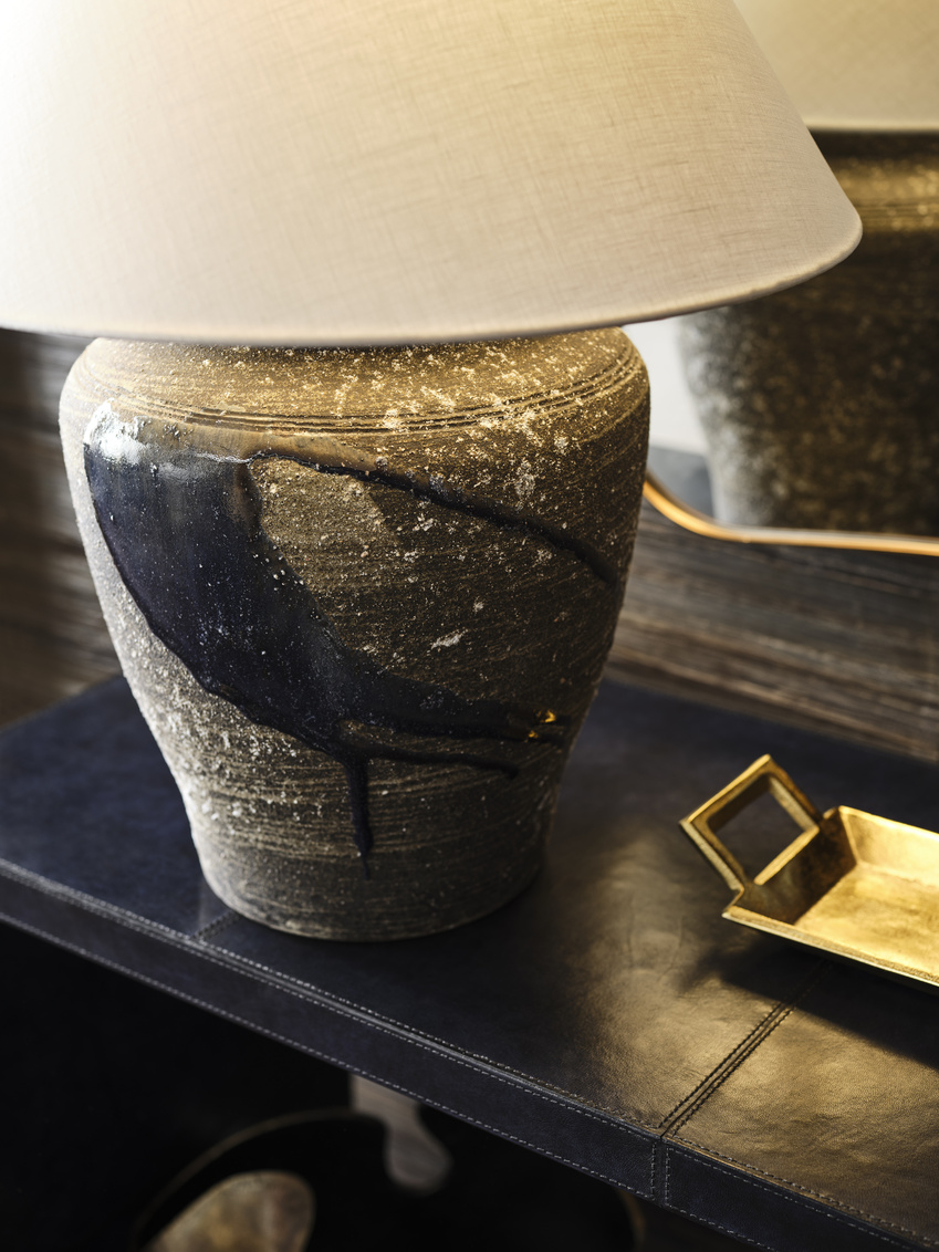 The Riku Table Lamp, part of the Shiga collection, offers a modern interpretation of traditional Japanese artistry, combining raw clay with a smooth drip glaze. The hand-turned ceramic body features a natural, earthy finish that highlights the organic texture of the clay unique to the Shigaraki region, while the glossy indigo glaze flows down the surface. This fusion of rough and refined elements makes the Riku Lamp a unique statement piece that blends timeless craftsmanship with contemporary design.