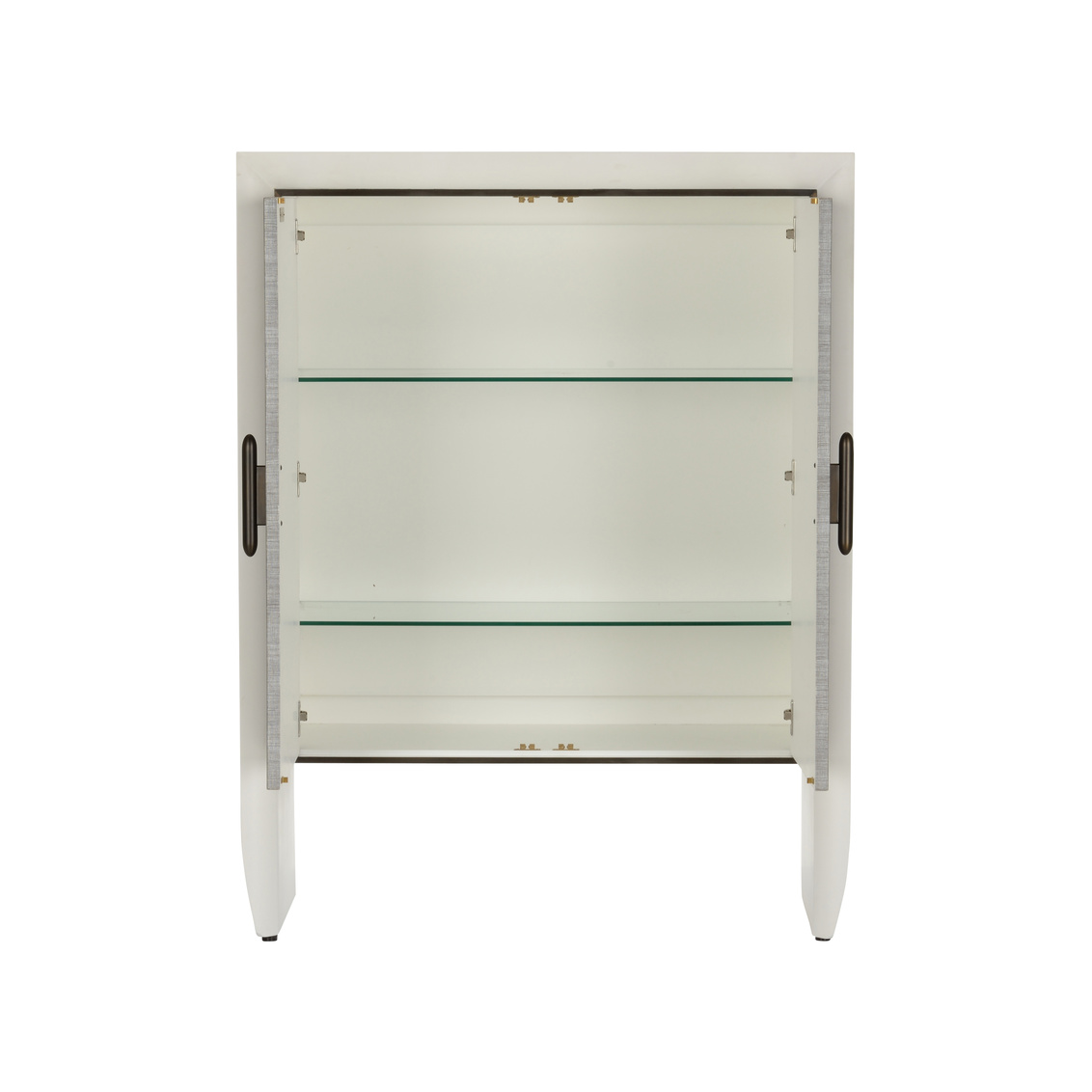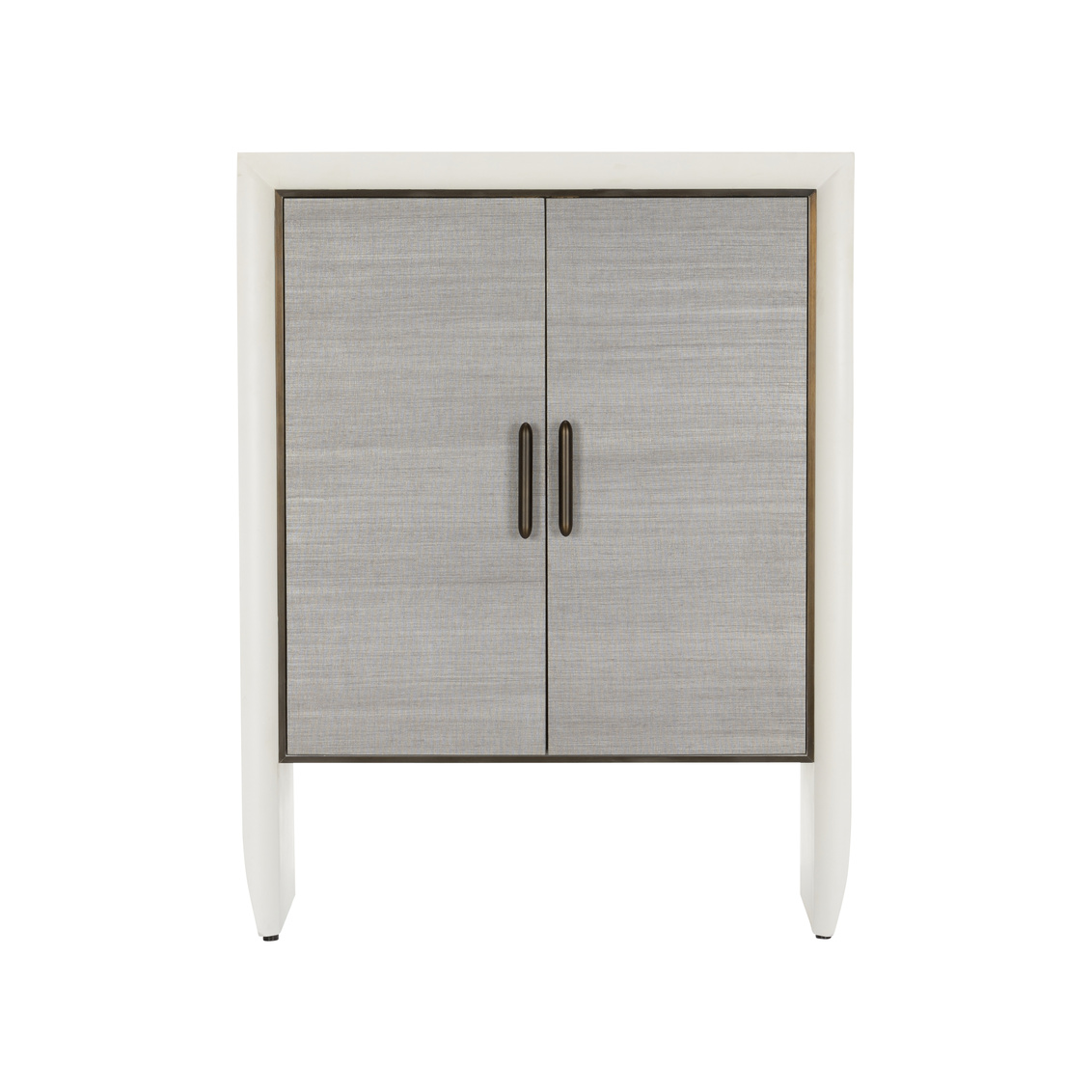 Introducing the Zep Bar Cabinet, a sleek and modern addition to any contemporary living space. The cabinet boasts a minimalist white wood frame with a bold and striking presence, accentuated by its slightly curved legs that add a touch of elegance to its silhouette. The front features gray grasscloth doors, lending a soft texture and a subtle, sophisticated pattern to the design. Enhanced by bronze hardware, the handles complement the muted tones of the cabinet while providing a stylish contrast. Finished with two interior glass shelves, this piece is perfect for storing your favorite spirits, glassware, and bar accessories, making it a functional and chic statement in your home.