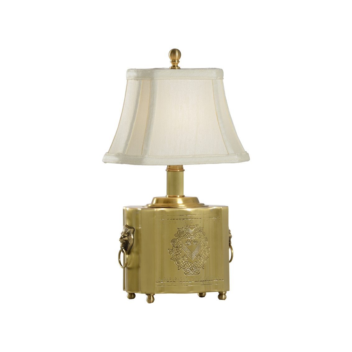 Inspired by an ancient tea box, this table lamp features lion head handles on an engraved tea box crafted of solid brass with antique patina. A bone silk shade and matching finial complete the design whose size and scale make it ideal for a bookcase or side table in a traditional home.