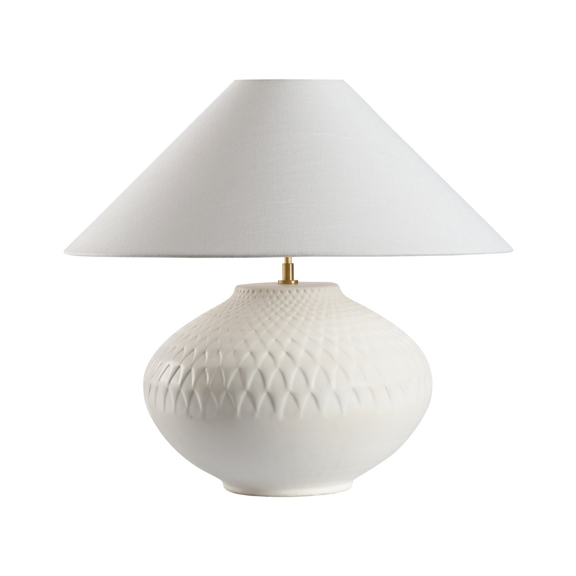 The Manzoni Lamp makes a bold, sculptural statement with its low, rounded form and dimensional surface pattern. Made in Italy from ceramic with a white matte glaze, it brings a grounded elegance and modern edge to any setting.