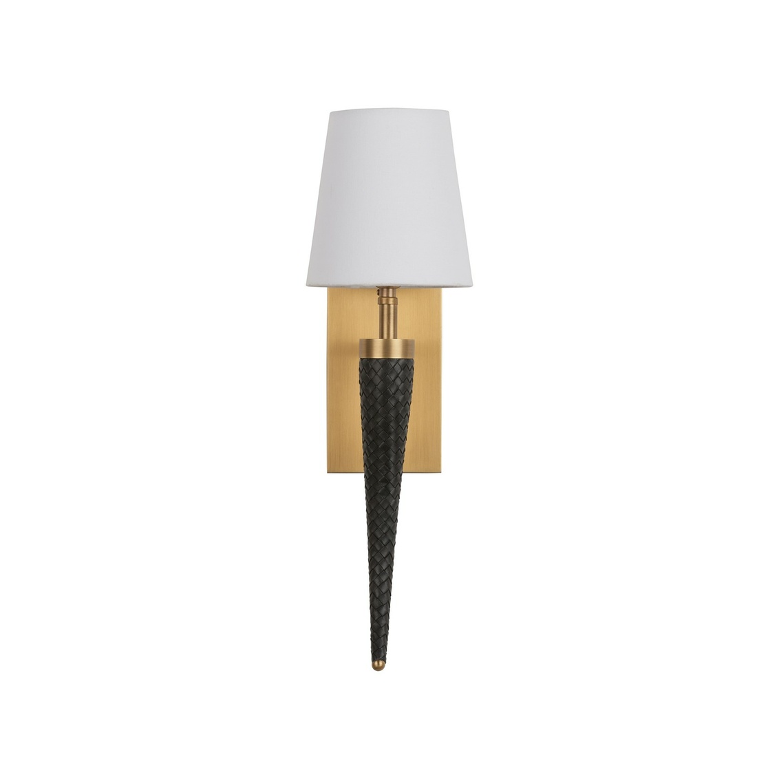 The Wexler Sconce is a bold fusion of braided leather and brass, offering a refined yet distinctive design. With its sculptural horn-like form and white linen shade, this sconce brings a sophisticated edge to any space, perfect for adding warmth and character to your walls.