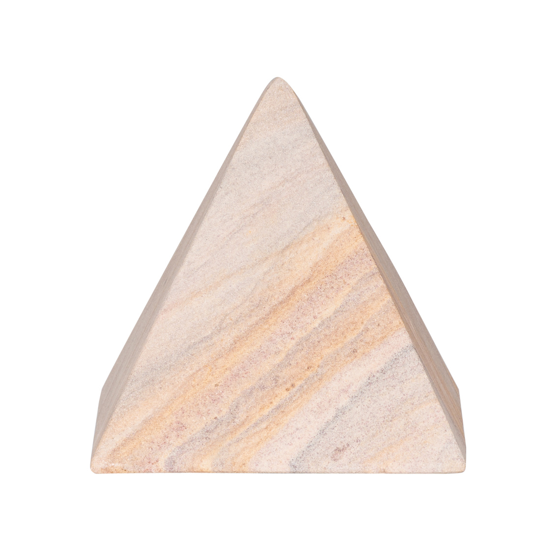 The Icarus Pyramid is a sculptural accent crafted from natural sandstone, showcasing soft striations and earthy tones unique to each piece. Its geometric form adds a grounding, architectural element to shelves, desks, or tabletop displays.
