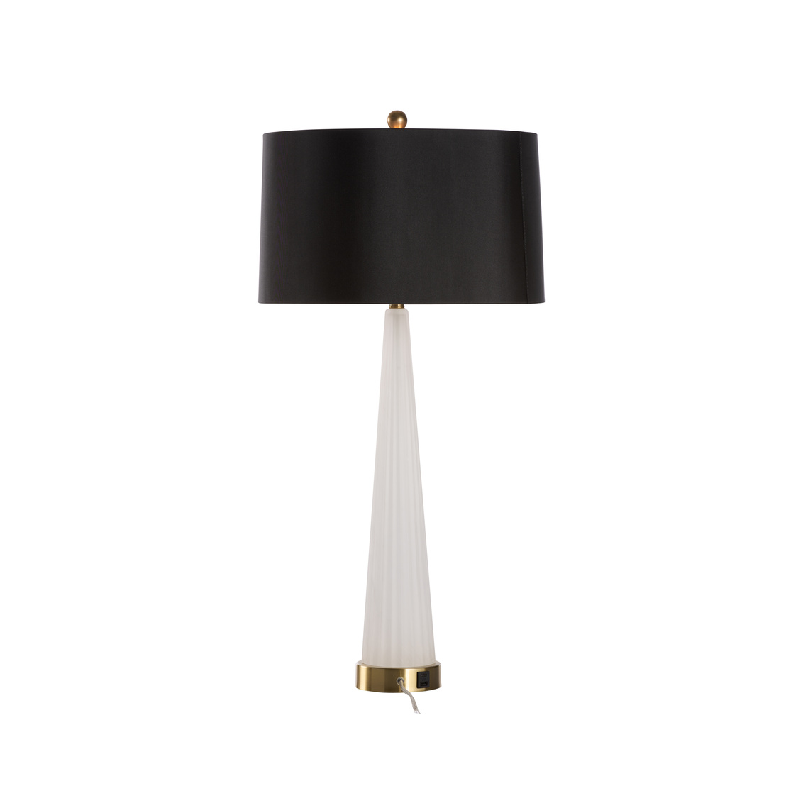 The Ava Lamp features a fluted glass body in a crisp, tapered silhouette, anchored by a polished brass base and topped with a bold black shade. Equipped with a built-in USB port, it effortlessly blends elegance and modern functionality.