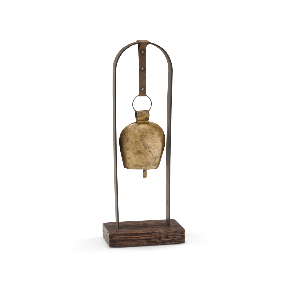 Brass horseshoe bell with patina, wood and iron suspension