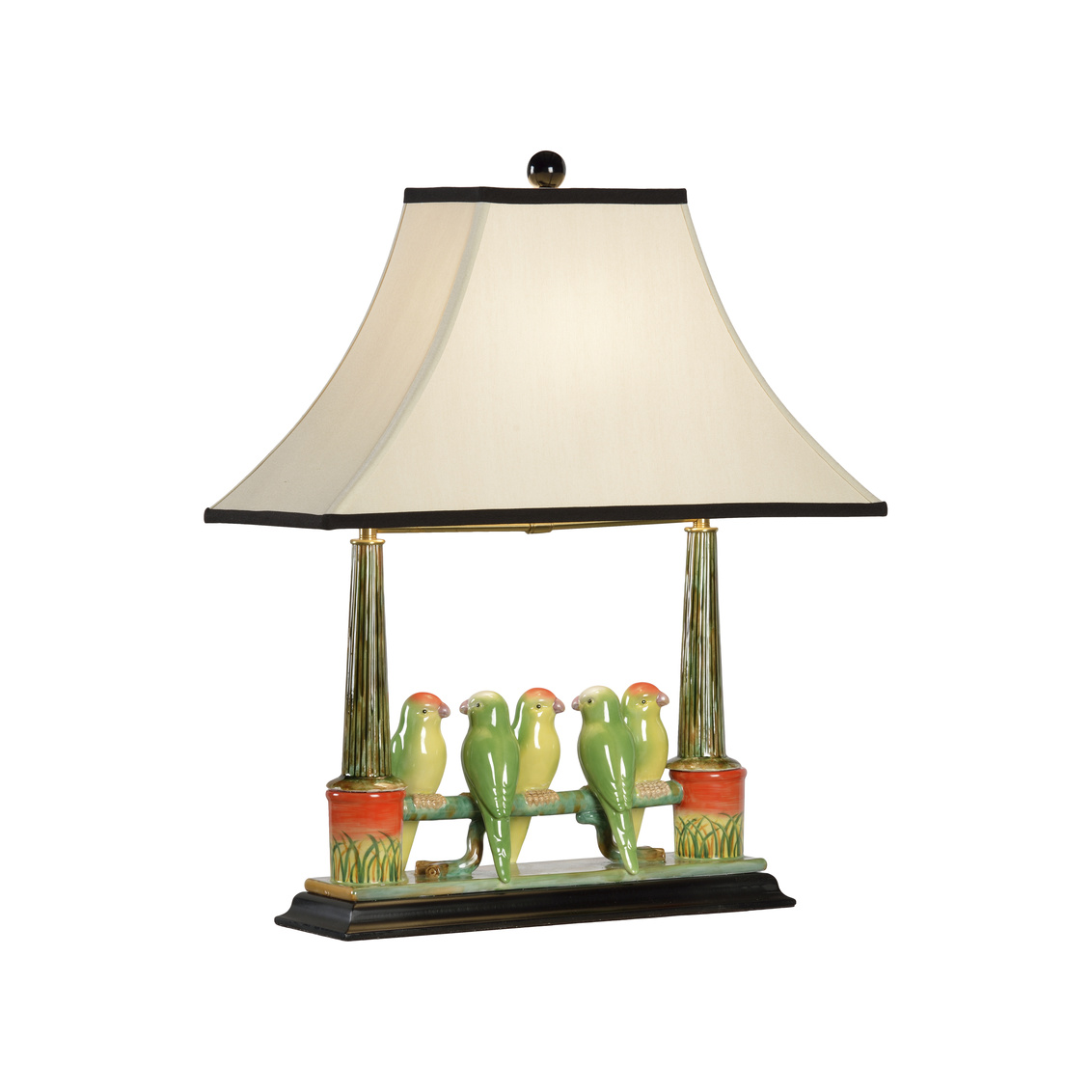 Add a touch of nature to your home with this delightful Budgies Lamp. Crafted of hand painted and glazed fired ceramic, five colorful parakeets are perched upon a fence. A light tan shade with black trim directs light to highlight the birds and bring ample lighting to your space. The Newport Mansion collection (green, yellow, orange)