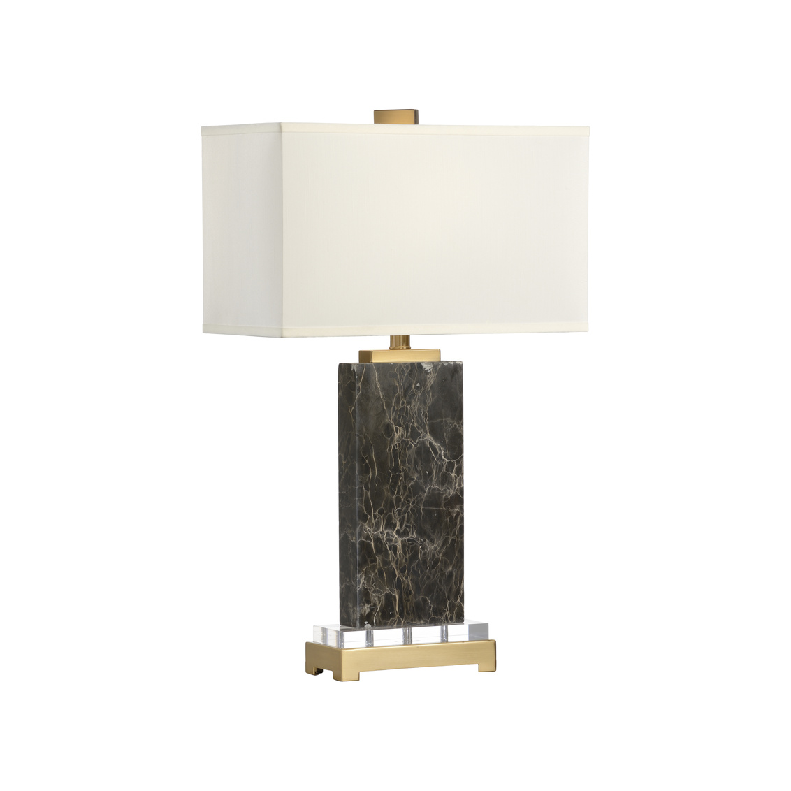 A masculine design combines with feminine accents to create this 27.5" contemporary table lamp. Jackson lamp features a rectangular slab of natural brown marble juxtaposed by the soft golden accents and clear acrylic base. An elegant off white silkette shade tops the design that blends effortlessly with your existing decor.