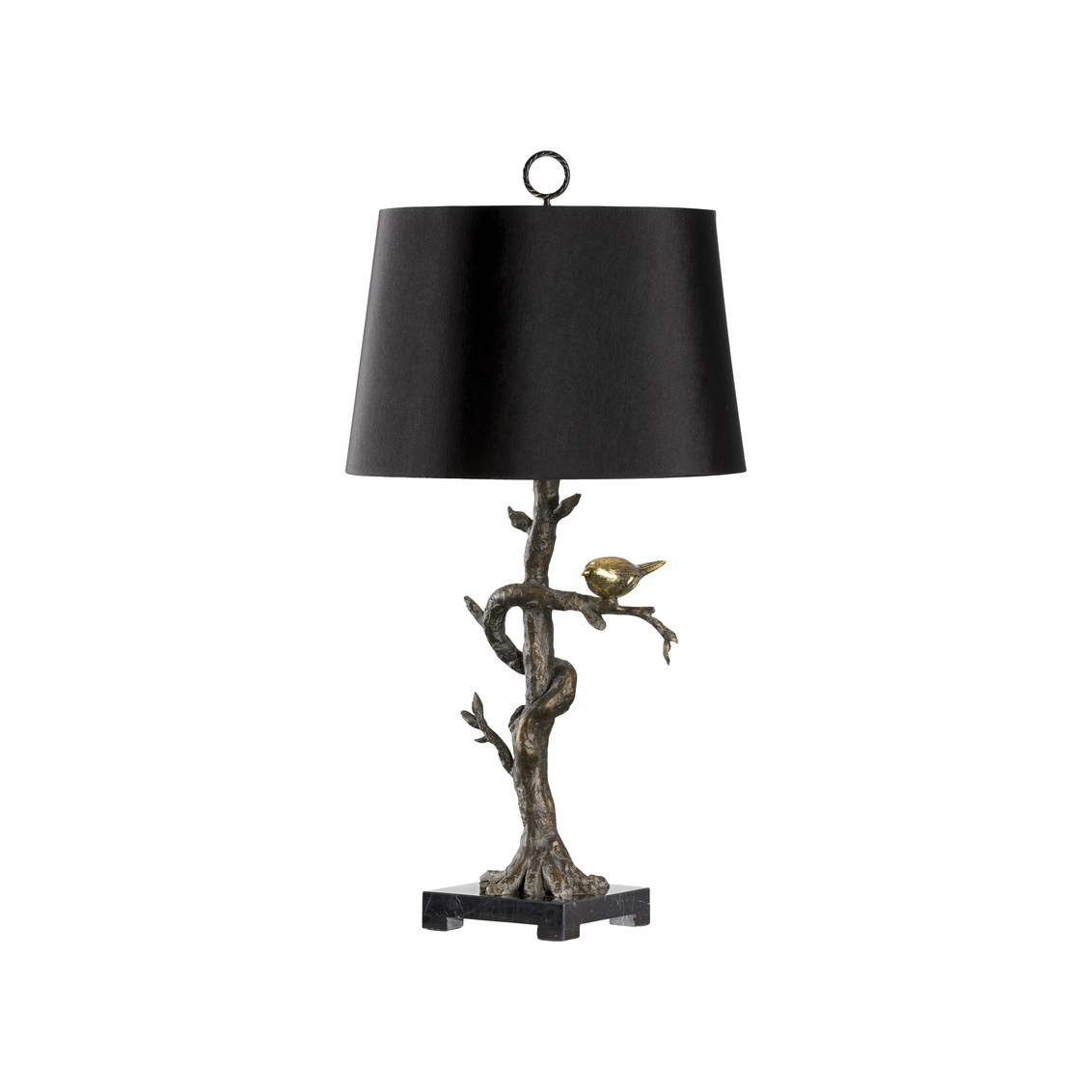 Brighten your home decor with this nature inspired lamp. Crafted in cast composite, the bronze finished tree with its interlaced branch creates elegant movement. The antique brass finished bird reflects the glow from the light generating an eye-catching design. A natural black marble base and black silkette tapered drum shade complete the look worthy of a tabletop in your living area, sunroom or entryway.