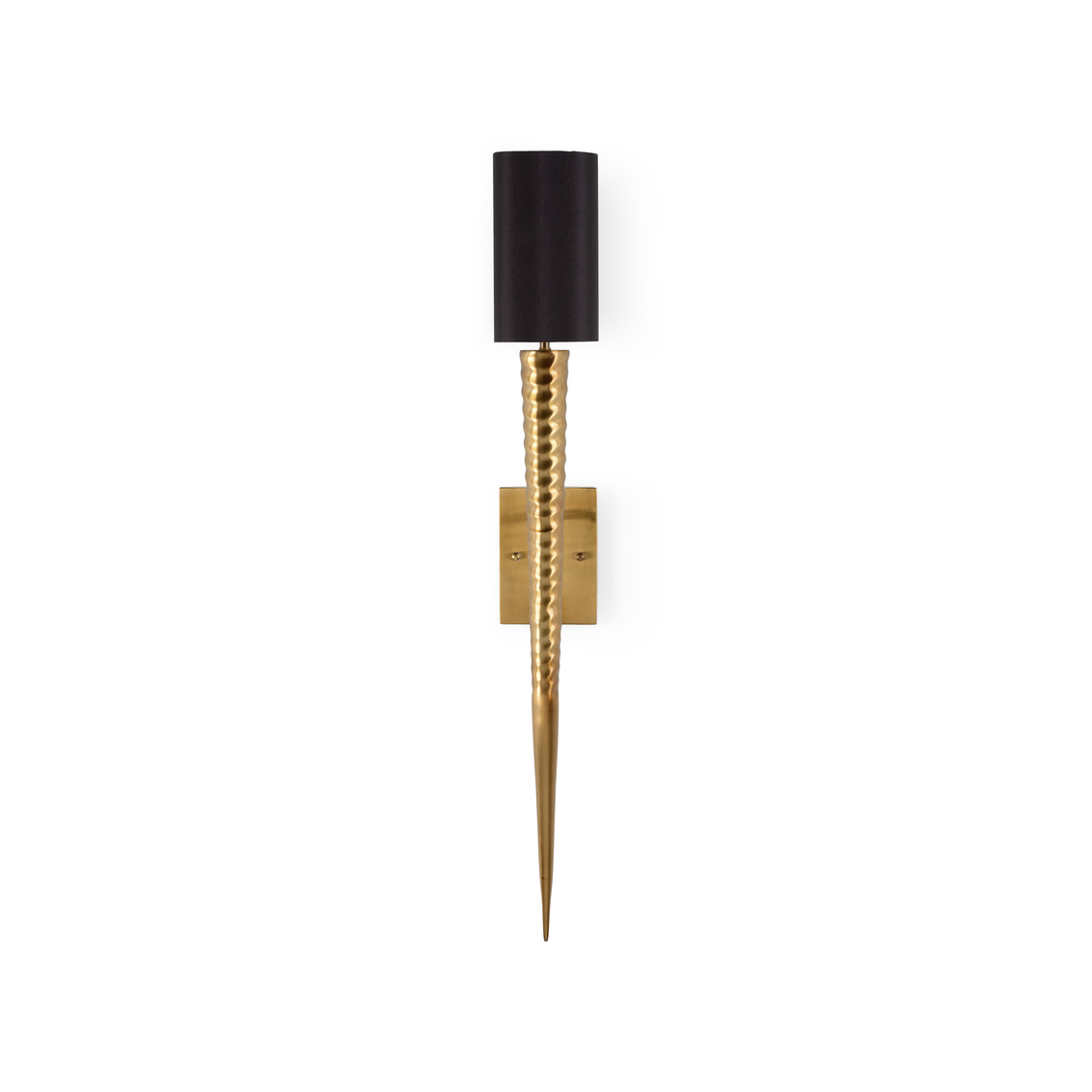 Tarnished brass finished, one light wall sconce with a black silkette shade