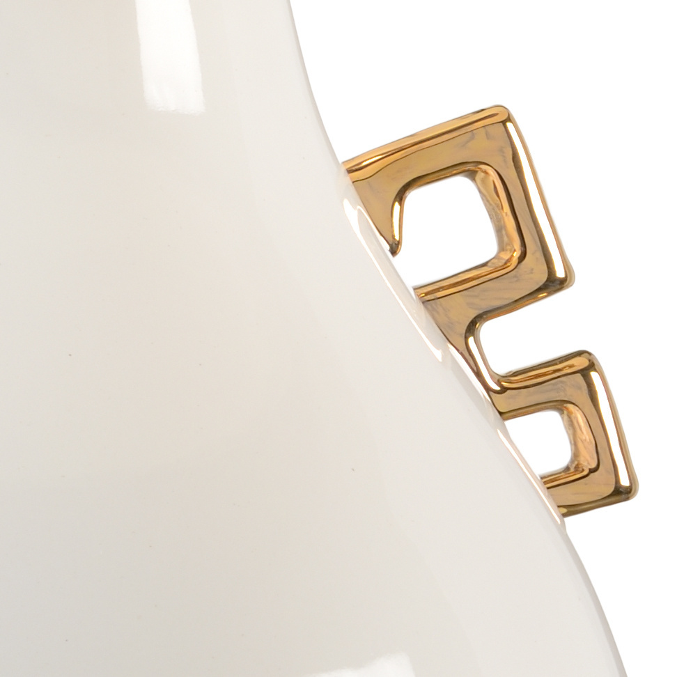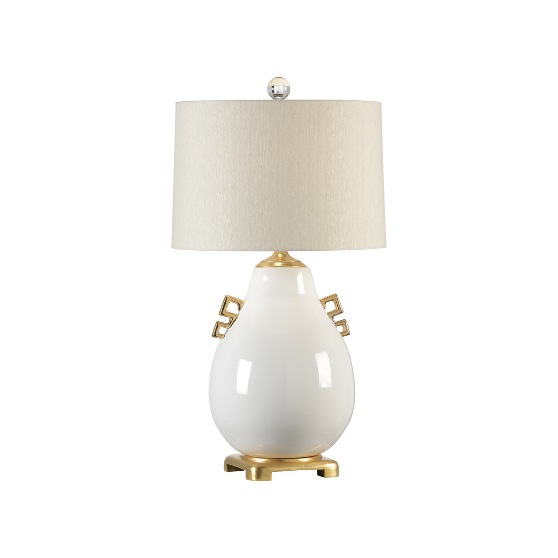 The Ming Lamp features a large, pear-shaped ceramic body with a white glazed finish, perched on a square gold leaf base. Elegant geometric handles and a classic drum shade complete this timeless design, blending sculptural form with modern sophistication.