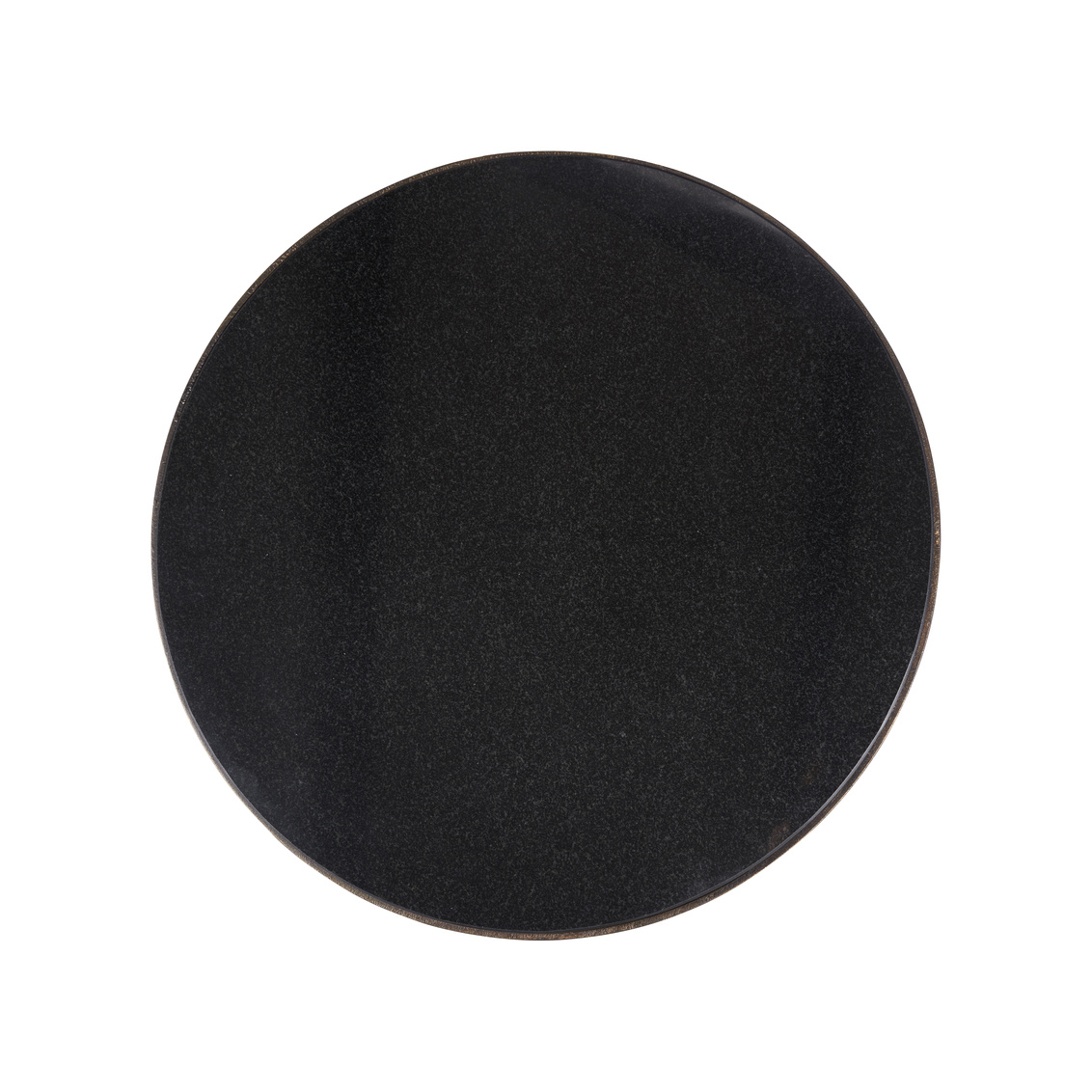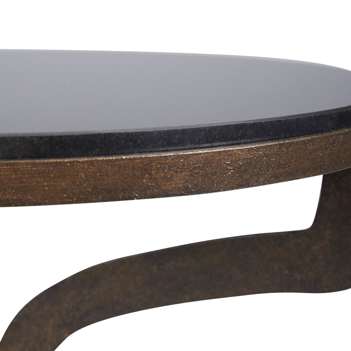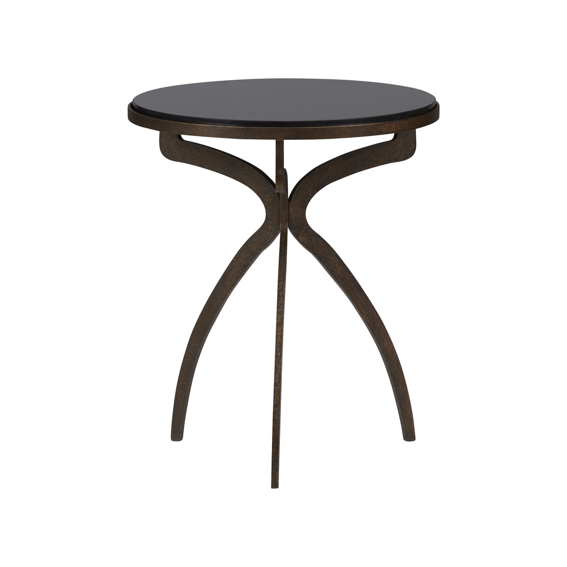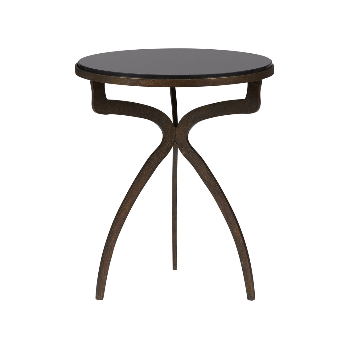 Iron side table with textured bronze finish with a natural black marble top