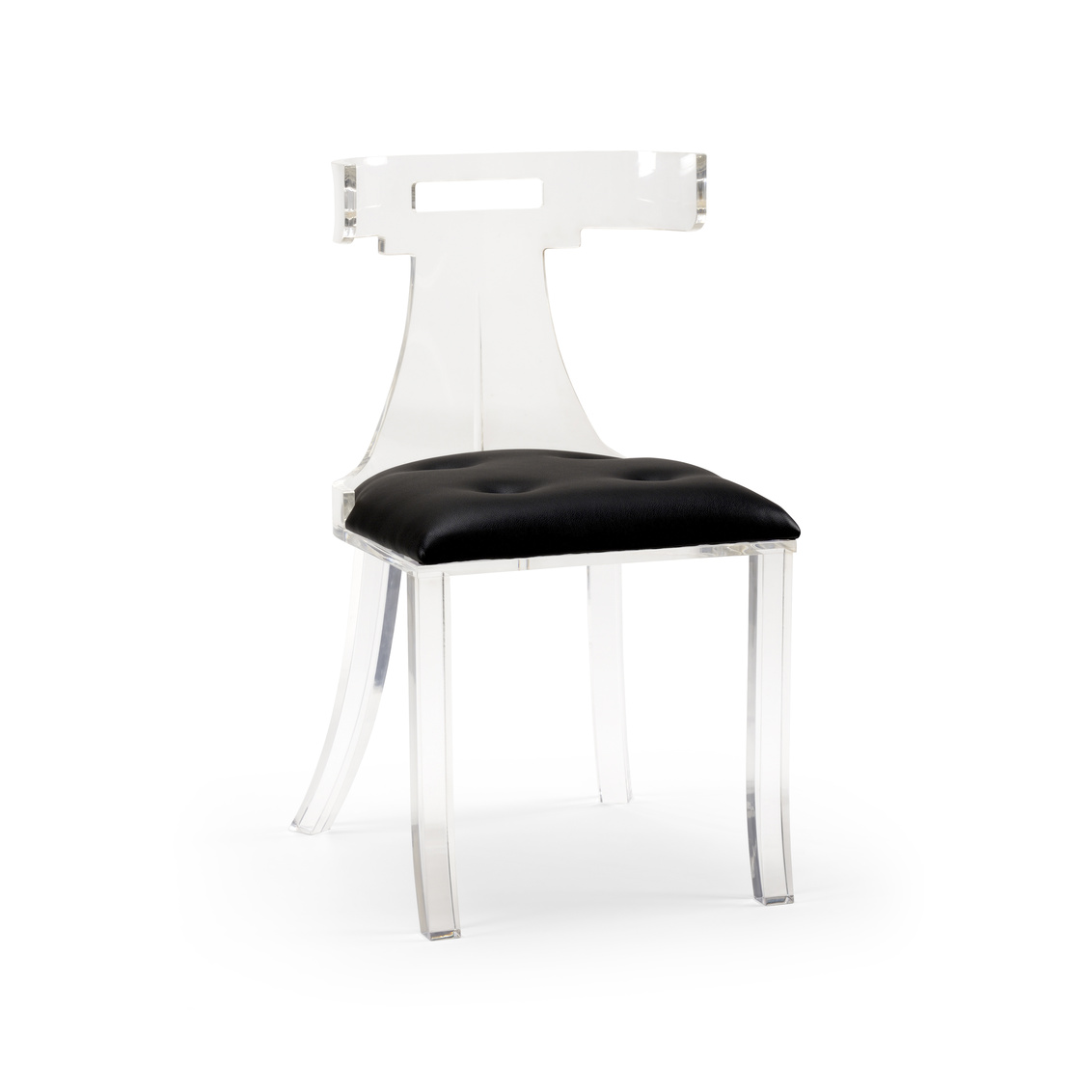 Reminiscent of the Klismos design, Elsa Chair features the elegant, curved legs and back displayed in the original ancient Greek armchair. This clear acrylic chair has a delicate look but is structurally sound. A removable black tufted leather cushion fits the seat providing comfort and continuing the modern design theme. This versatile chair is a great addition to a dining table or as an accent chair in your sunroom, foyer or living area.
