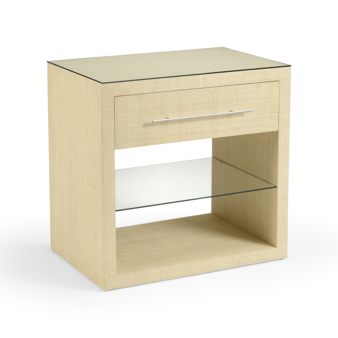 Multi level bedside table wrapped in natural raffia with a drawer and a tempered glass shelf and top. Nickel hardware.